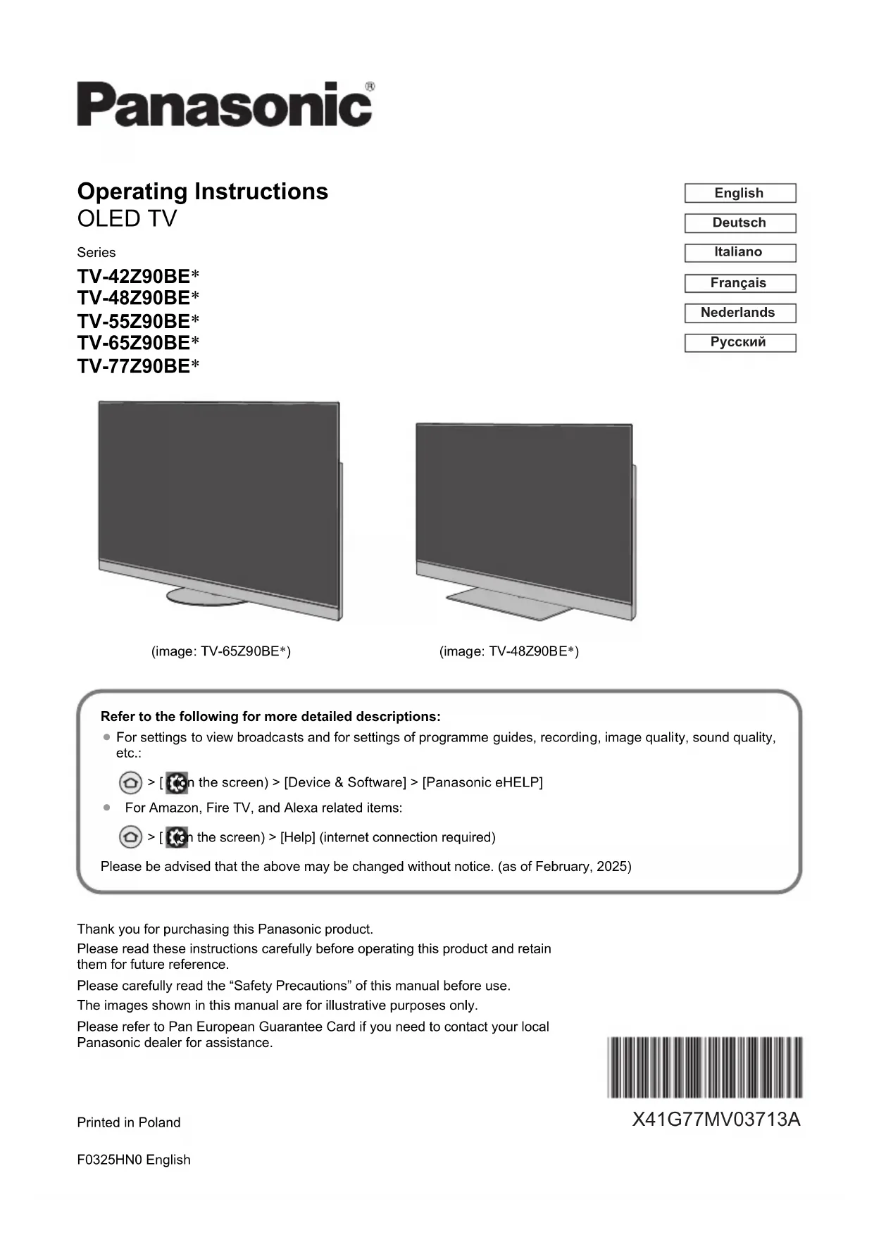 Operating Instructions OLED TV Series TV-42Z90BE* TV-48Z90BE* TV-55Z90BE* TV-65Z90BE* TV-77Z90BE* (image: TV-65Z90BE*) (image: TV-48Z90BE*) Refer to the following for more detailed descriptions: ≥ For settings to view broadcasts and for settings of programme guides, recording, image quality, sound quality, etc.: > [ ] (on the screen) > [Device & Software] > [Panasonic eHELP] ≥ For Amazon, Fire TV, and Alexa related items: > [ ] (on the screen) > [Help] (internet connection required) Please be advised that the above may be changed without notice. (as of February, 2025) Thank you for purchasing this Panasonic product. Please read these instructions carefully before operating this product and retain them for future reference. Please carefully read the “Safety Precautions” of this manual before use. The images shown in this manual are for illustrative purposes only. Please refer to Pan European Guarantee Card if you need to contact your local Panasonic dealer for assistance. F0325HN0 English X41G77MV03713A Printed in Poland English Deutsch Italiano Français Nederlands