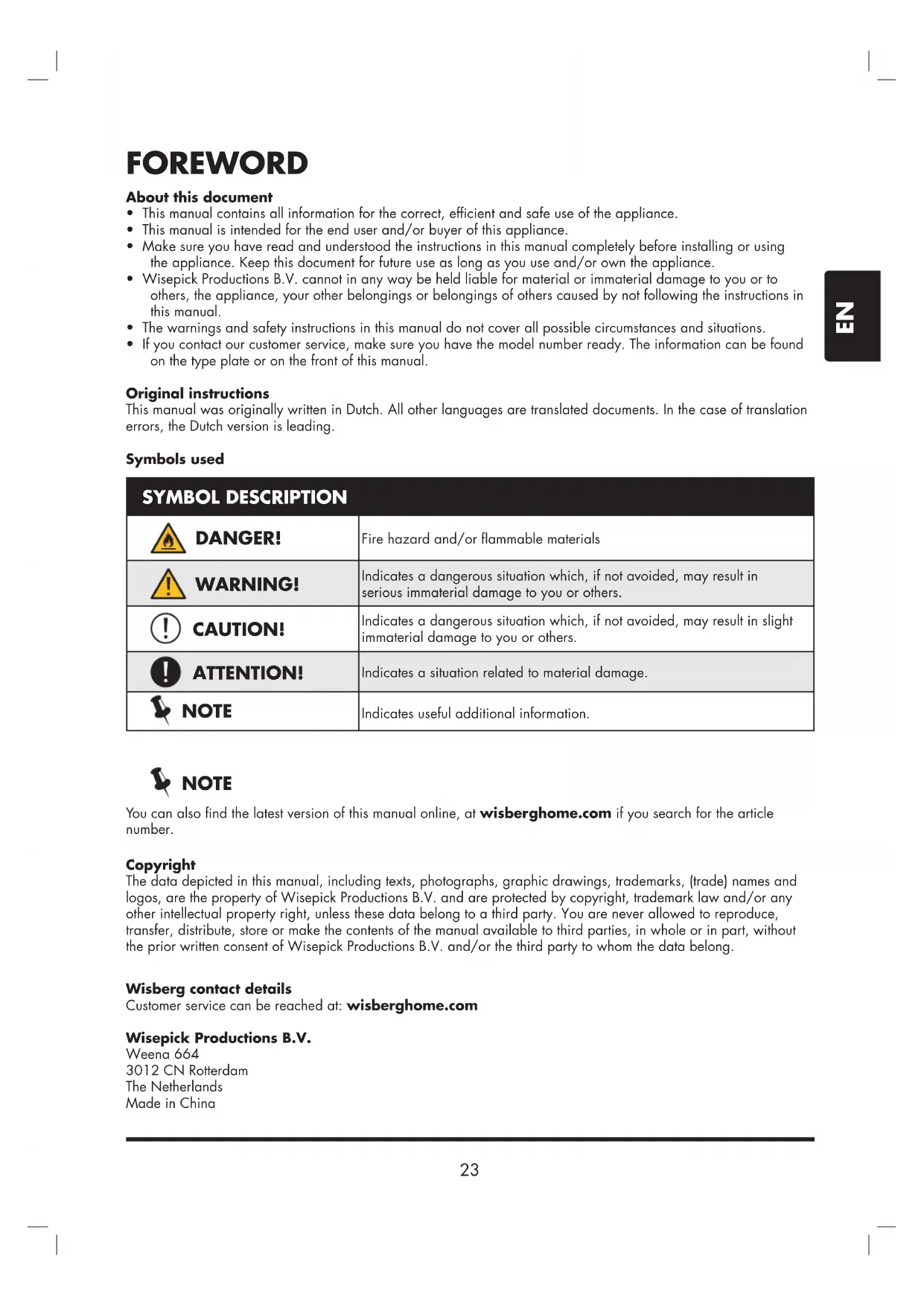 - If you contact our customer service, make sure you have the model number ready. The information can be found on the type plate or on the front of this manual. Original instructions This manual was originally written in Dutch. All other languages are translated documents. In the case of translation errors, the Dutch version is leading. Symbols used SYMBOL DESCRIPTION Fire hazard and/or ammable materials Indicates a dangerous situation which, if not avoided, may result in serious immaterial damage to you or others. Indicates a dangerous situation which, if not avoided, may result in slight immaterial damage to you or others. Indicates a situation related to material damage. Indicates useful additional information. You can also nd the latest version of this manual online, at wisberghome.com if you search for the article number. DANGER! CAUTION! ATTENTION! WARNING! NOTE NOTE Copyright The data depicted in this manual, including texts, photographs, graphic drawings, trademarks, (trade) names and logos, are the property of Wisepick Productions B.V. and are protected by copyright, trademark law and/or any other intellectual property right, unless these data belong to a third party. You are never allowed to reproduce, transfer, distribute, store or make the contents of the manual available to third parties, in whole or in part, without the prior written consent of Wisepick Productions B.V. and/or the third party to whom the data belong. Wisberg contact details Customer service can be reached at: wisberghome.com Wisepick Productions B.V. Weena 664 3012 CN Rotterdam The Netherlands Made in China24