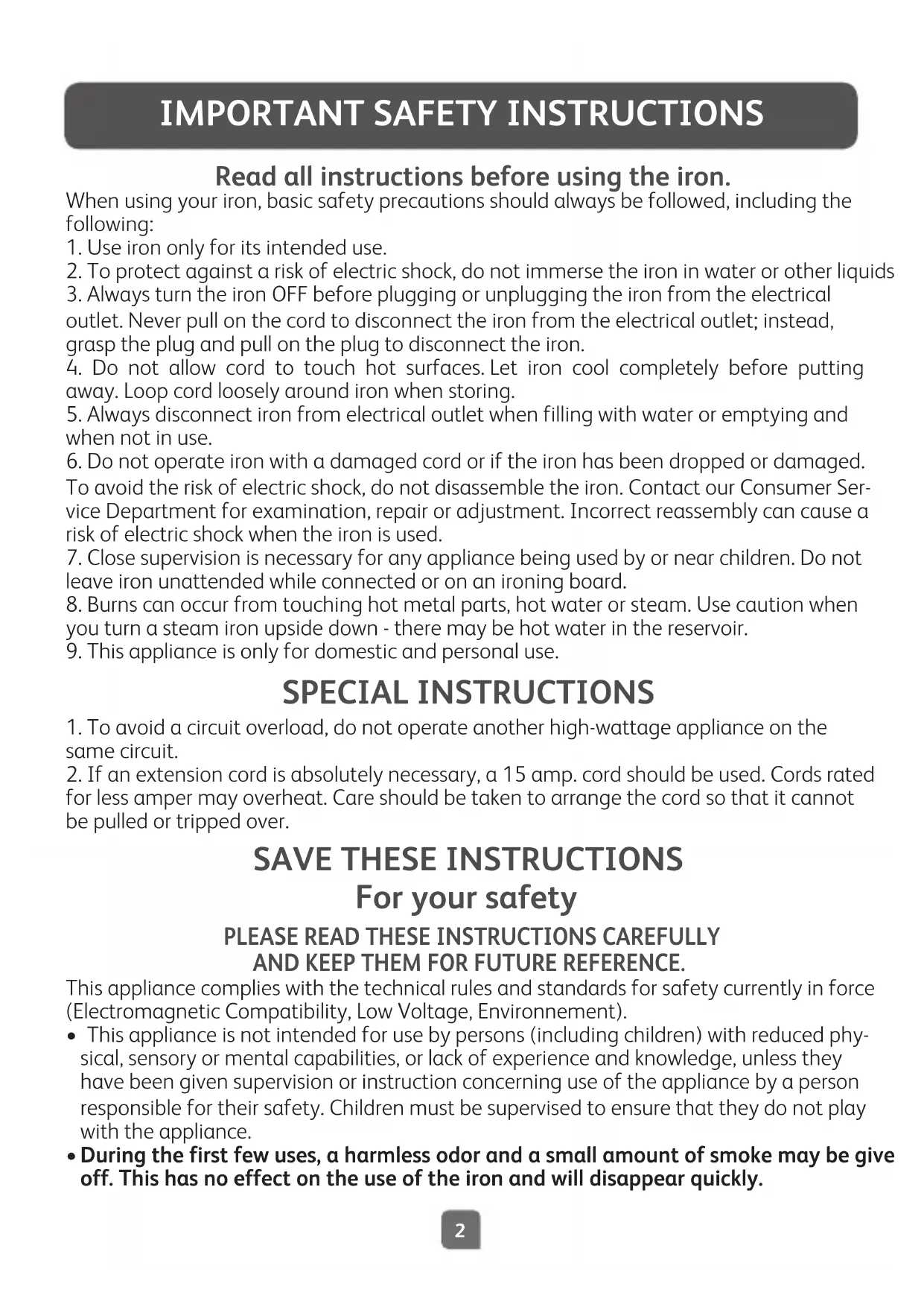 AND KEEP THEM FOR FUTURE REFERENCE. This appliance complies with the technical rules and standards for safety currently in force (Electromagnetic Compatibility, Low Voltage, Environnement).• This appliance is not intended for use by persons (including children) with reduced phy-sical, sensory or mental capabilities, or lack of experience and knowledge, unless they have been given supervision or instruction concerning use of the appliance by a person responsible for their safety. Children must be supervised to ensure that they do not play with the appliance. During the first few uses, a harmless odor and a small amount of smoke may be given off. This has no effect on the use of the iron and will disappear quickly.3
