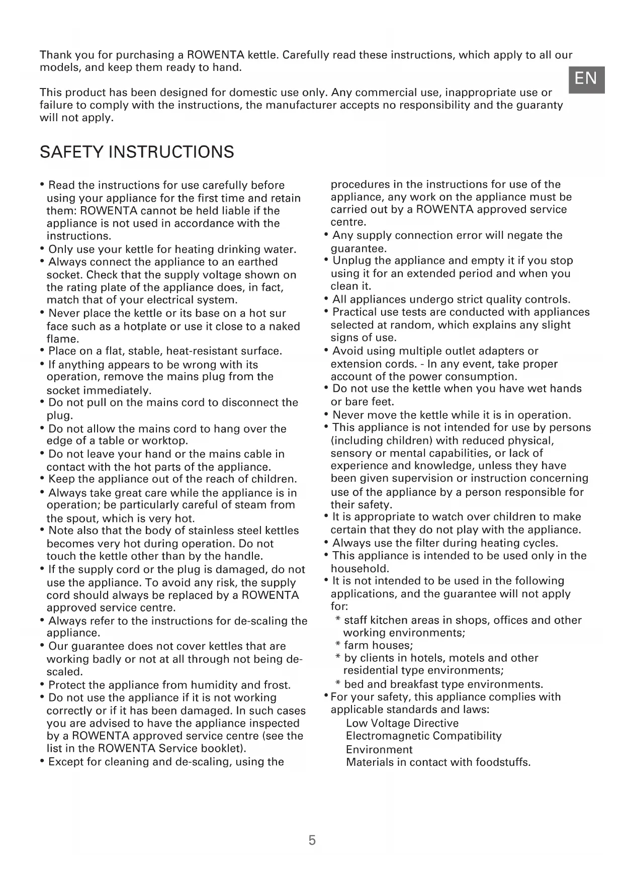 - The kettle does not work or stops before coming to the boil - Check that your kettle is properly plugged in. - The kettle has been switched on without water or an accumulation of scale has caused the overheat cut-out to operate: allow the ket tle to cool and fill it with water. Descale first if scale has accumulated. Switch it on: the kettle should start working again after about 15 minutes. IF YOUR KETTLE HAS BEEN DROPPED, IF IT LEAKS OR IF THERE IS VISIBLE DAMAGE TO THE POWER CORD, THE PLUG OR THE BASE OF THE KETTLE: Return your kettle to your ROWENTA After-Sales Service Centre, only they are authorised to carry out repairs. See the guarantee conditions and list of centres in the booklet supplied with your kettle. The type and serial number are shown on the bottom of your kettle. This guarantee covers manufacturing defects and domestic use only. Any breakage or damage resulting from failure to comply with the instructions for use is not covered by the guarantee. ROWENTA reserves the right to modify the characteristics or components of its kettles at any time in the interests of the consumer. Do not use the kettle. No attempt must be made to dismantle the kettle or its safety devices. If the supply cord is damaged, it must be replaced by the manufacturer, its after-sales service centre or a similarly qualified person, in order to avoid any danger.