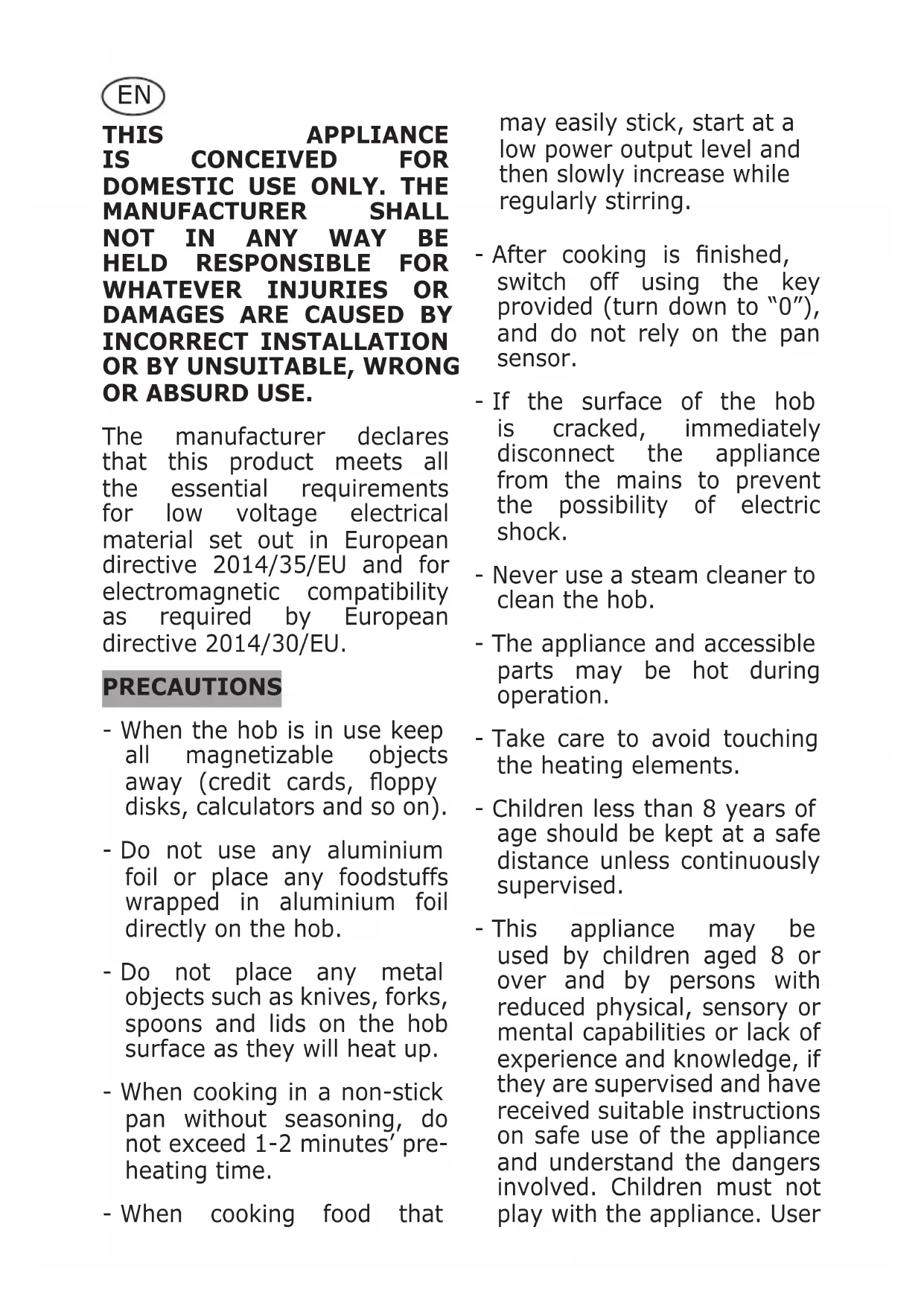 OR ABSURD USE. The manufacturer declares that this product meets all the essential requirements for low voltage electrical material set out in European directive 2014/35/EU and for electromagnetic compatibility as required by European directive 2014/30/EU. PRECAUTIONS - When the hob is in use keep all magnetizable objects away (credit cards, oppy disks, calculators and so on). - Do not use any aluminium foil or place any foodstuffs wrapped in aluminium foil directly on the hob. - Do not place any metal objects such as knives, forks, spoons and lids on the hob surface as they will heat up. - When cooking in a non-stick pan without seasoning, do not exceed 1-2 minutes’ pre- heating time. - When cooking food that - After cooking is nished, switch off using the key provided (turn down to “0”), and do not rely on the pan sensor. - If the surface of the hob is cracked, immediately disconnect the appliance from the mains to prevent the possibility of electric shock. - Never use a steam cleaner to clean the hob. - The appliance and accessible parts may be hot during operation. - Take care to avoid touching the heating elements. - Children less than 8 years of age should be kept at a safe distance unless continuously supervised. - This appliance may be used by children aged 8 or over and by persons with reduced physical, sensory or mental capabilities or lack of experience and knowledge, if they are supervised and have received suitable instructions on safe use of the appliance and understand the dangers involved. Children must not play with the appliance. User may easily stick, start at a low power output level and then slowly increase while regularly stirring. ENmaintenance and cleaning should not be carried out by children except under constant supervision. - Cooking with grease or oil may be dangerous and cause