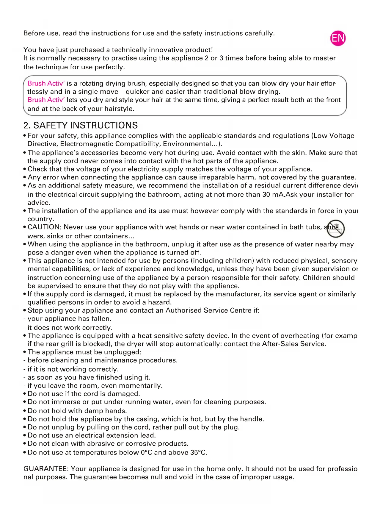 - Do not use at temperatures below 0°C and above 35°C. GUARANTEE: Your appliance is designed for use in the home only. It should not be used for professio- nal purposes. The guarantee becomes null and void in the case of improper usage.