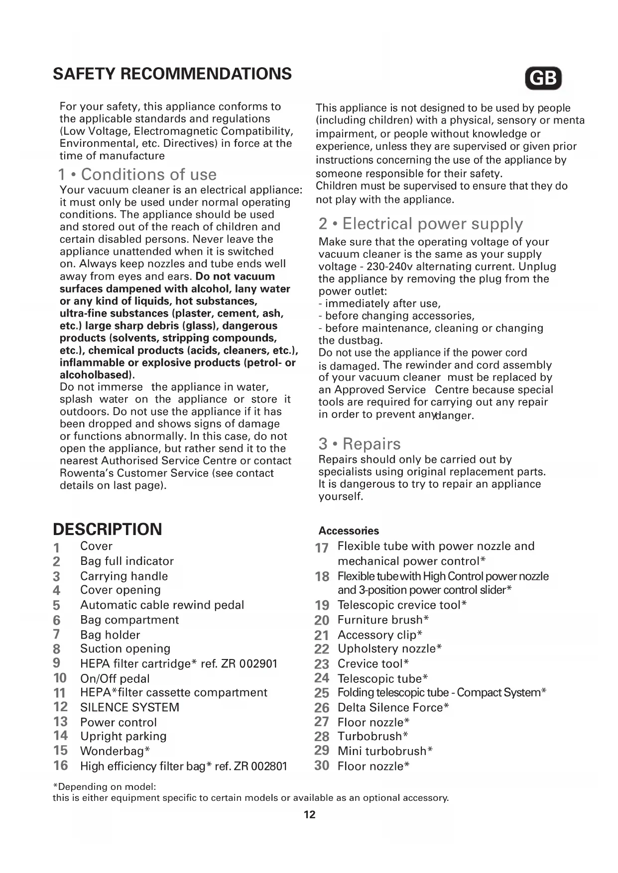 IFU 730290:730290 SF 9/02/09 11:43 Page 14For your safety, this appliance conforms to the applicable standards and regulations (Low Voltage, Electromagnetic Compatibility, Environmental, etc. Directives) in force at the time of manufacture Your vacuum cleaner is an electrical appliance: it must only be used under normal operating conditions. The appliance should be used and stored out of the reach of children and certain disabled persons. Never leave the appliance unattended when it is switched on. Always keep nozzles and tube ends well away from eyes and ears. Do not vacuum surfaces dampened with alcohol, lany water or any kind of liquids, hot substances, ultra-fine substances (plaster, cement, ash, etc.) large sharp debris (glass), dangerous products (solvents, stripping compounds, etc.), chemical products (acids, cleaners, etc.), inflammable or explosive products (petrol- or alcoholbased). Do not immerse the appliance in water, splash water on the appliance or store it outdoors. Do not use the appliance if it has been dropped and shows signs of damage or functions abnormally. In this case, do not open the appliance, but rather send it to the nearest Authorised Service Centre or contact Rowenta’s Customer Service (see contact details on last page). Make sure that the operating voltage of your vacuum cleaner is the same as your supply voltage - 230-240v alternating current. Unplug the appliance by removing the plug from the power outlet: - immediately after use, - before changing accessories, - before maintenance, cleaning or changing the dustbag. The rewinder and cord assembly of your vacuum cleaner must be replaced by an Approved Service Centre because special tools are required for carrying out any repair in order to prevent any danger. Repairs should only be carried out by specialists using original replacement parts. It is dangerous to try to repair an appliance yourself. SAFETY RECOMMENDATIONS 1 • Conditions of use DESCRIPTION Cover Bag full indicator Carrying handle Cover opening Automatic cable rewind pedal Bag compartment Bag holder Suction opening HEPA filter cartridge* ref. ZR 002901 On/Off pedal HEPA*filter cassette compartment SILENCE SYSTEM Power control Upright parking Wonderbag* High efficiency filter bag* ref. ZR 002801 Flexible tube with power nozzle and mechanical power control* FlexibletubewithHighControlpowernozzle and 3-position power control slider* Telescopic crevice tool* Furniture brush* Accessory clip* Upholstery nozzle* Crevice tool* Telescopic tube* Folding telescopic tube - Compact System* Delta Silence Force* Floor nozzle* Turbobrush* Mini turbobrush* Floor nozzle* *Depending on model: this is either equipment specific to certain models or available as an optional accessory. 2 • Electrical power supply 3 • Repairs Accessories