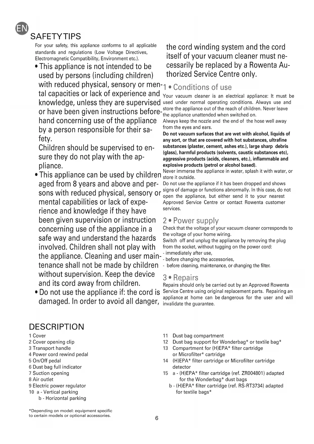 - Do not use the appliance if: the cord is damaged. In order to avoid all danger, the cord winding system and the cord itself of your vacuum cleaner must ne- cessarily be replaced by a Rowenta Au- thorized Service Centre only. 1 • Conditions of use Your vacuum cleaner is an electrical appliance: It must be used under normal operating conditions. Always use and store the appliance out of the reach of children. Never leave the appliance unattended when switched on. Always keep the nozzle and the end of the hose well away from the eyes and ears. Do not vacuum surfaces that are wet with alcohol, liquids of any sort, or that are covered with hot substances, ultrafine substances (plaster, cement, ashes etc.), large sharp debris (glass), harmful products (solvents, caustic substances etc), aggressive products (acids, cleaners, etc.), inflammable and explosive products (petrol or alcohol based). Never immerse the appliance in water, splash it with water, or store it outside. Do not use the appliance if it has been dropped and shows signs of damage or functions abnormally. In this case, do not open the appliance, but either send it to your nearest Approved Service Centre or contact Rowenta customer services. 2 • Power supply Check that the voltage of your vacuum cleaner corresponds to the voltage of your home wiring. Switch off and unplug the appliance by removing the plug from the socket, without tugging on the power cord: - immediately after use, - before changing the accessories, - before cleaning, maintenance, or changing the filter. 3 • Repairs Repairs should only be carried out by an Approved Rowenta Service Centre using original replacement parts. Repairing an appliance at home can be dangerous for the user and will invalidate the guarantee. DESCRIPTION 1 Cover 2 Cover opening clip 3 Transport handle 4 Power cord rewind pedal 5 On/Off pedal 6 Dust bag full indicator 7 Suction opening 8 Air outlet 9 Electric power regulator 10 a - Vertical parking b - Horizontal parking 11 Dust bag compartment 12 Dust bag support for Wonderbag* or textile bag* 13 Compartment for (H)EPA* filter cartridge or Microfilter* cartridge 14 (H)EPA* filter cartridge or Microfilter cartridge detector 15 a - (H)EPA* filter cartridge (ref. ZR004801) adapted for the Wonderbag* dust bags b - (H)EPA* filter cartridge (ref. RS-RT3734) adapted for textile bags* SAFETY TIPS