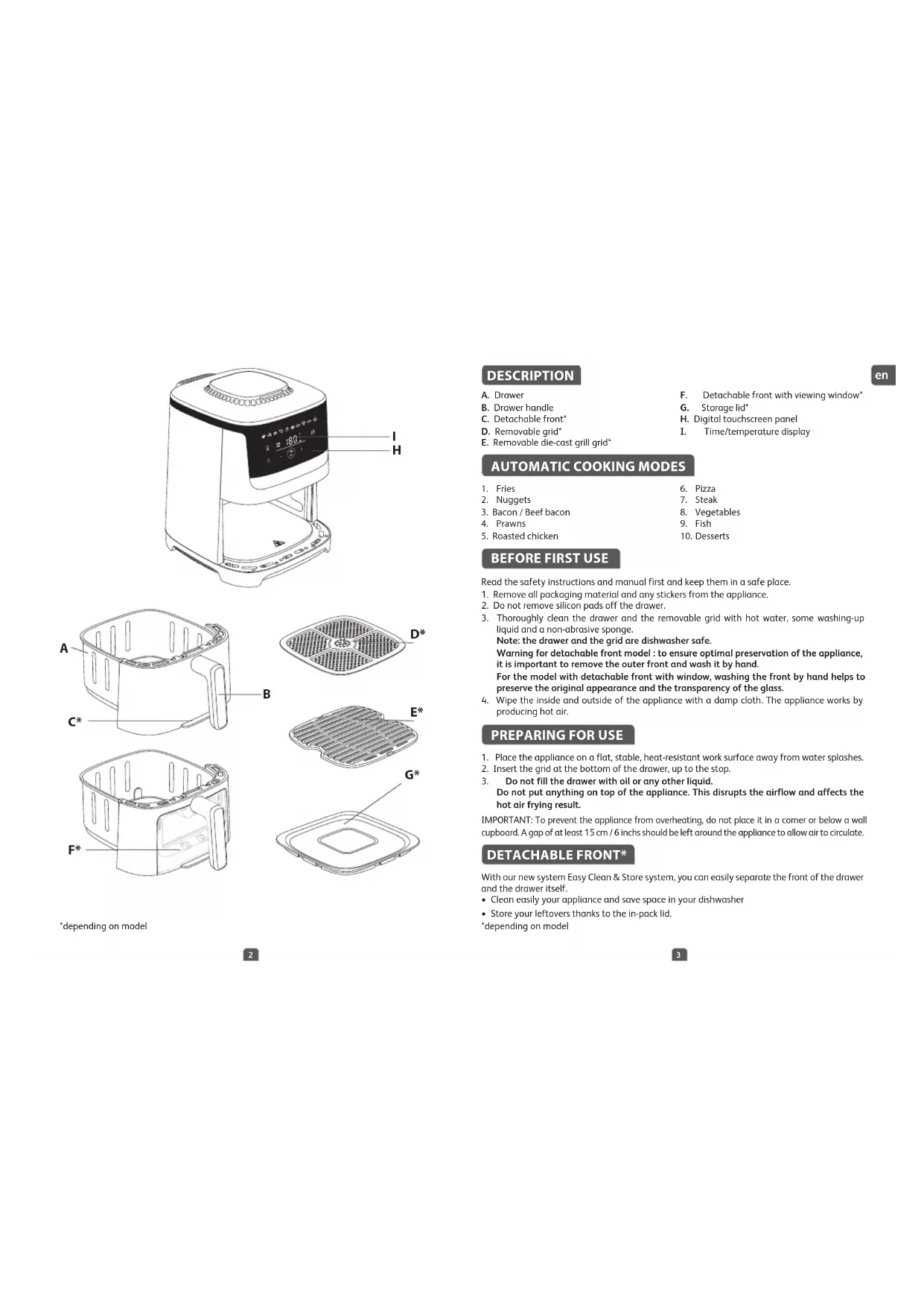 Do not put anything on top of the appliance. This disrupts the airflow and affects the hot air frying result. IMPORTANT: To prevent the appliance from overheating, do not place it in a corner or below a wall cupboard. A gap of at least 15 cm / 6 inchs should be left around the appliance to allow air to circulate. DETACHABLE FRONT* With our new system Easy Clean & Store system, you can easily separate the front of the drawer and the drawer itself.