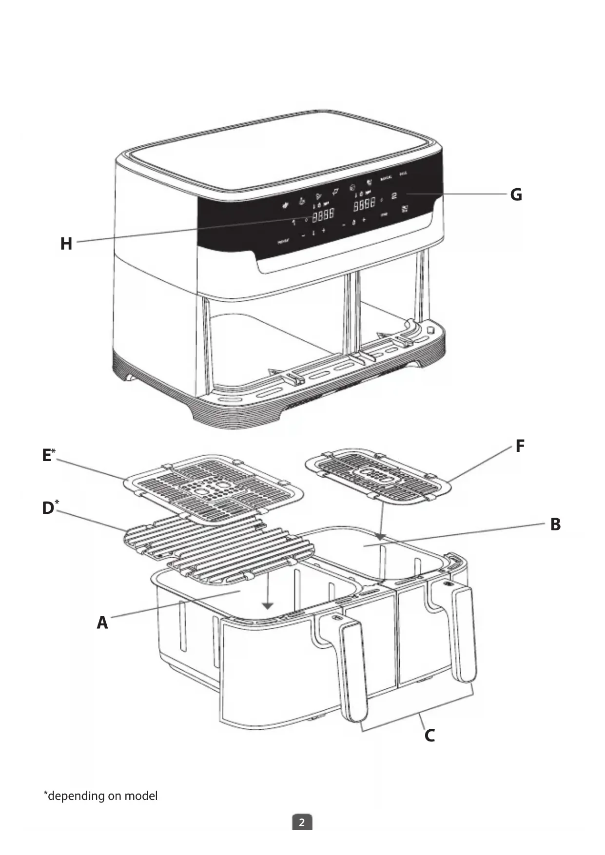 DESCRIPTION A. Drawer 1 (large bowl) B. Drawer 2 (regular bowl) C. Drawer handles D. Large removable die-cast grill grid with silicon pads (depending on model) E. Large removable grid with silicon pads (depending on model) F. Removable grid with silicon pads G. Digital touchscreen panel H. Time/temperature display DUAL EASY FRY user interface DUAL EASY FRY & GRILL user interface* OFF : indicates the drawer is off. To activate, click on 1 or 2 buttons. OFF : indicates the drawer is off. To activate, click on 1 or 2 buttons. : indicates grill preheating. Lights up when GRILL program just launched. *depending on model Preset cooking programs : Indicates the need to shake food. Lights up half way through cooking for fries program. Manual program : To activate the cooking synchronisation : To activate the cooking synchronisation Temperature settings Temperature settings Cooking time settings Cooking time settings BUTTON 1: To activate drawer 1 BUTTON 1: To activate drawer 1 BUTTON 2: To activate drawer 2 BUTTON 2: To activate drawer 2 Preset cooking programs : Indicates the need to shake food. Lights up half way through cooking for fries program. Manual program Grill programEN