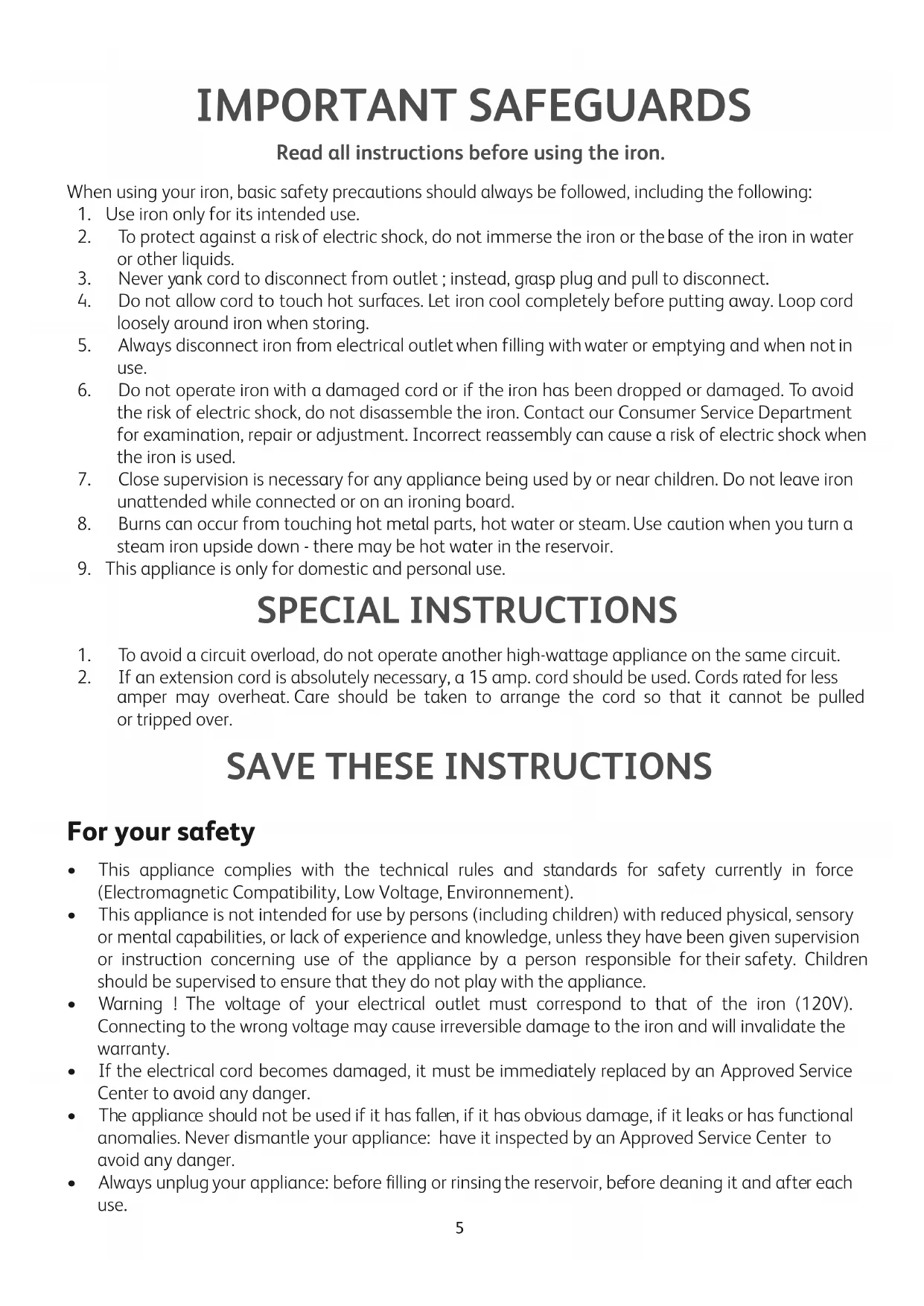 - Always unplug your appliance: before filling or rinsing the reservoir, before cleaning it and after each use. IMPORTANT SAFEGUARDS Read all instructions before using the iron. When using your iron, basic safety precautions should always be followed, including the following:11.1 Use iron only for its intended use.