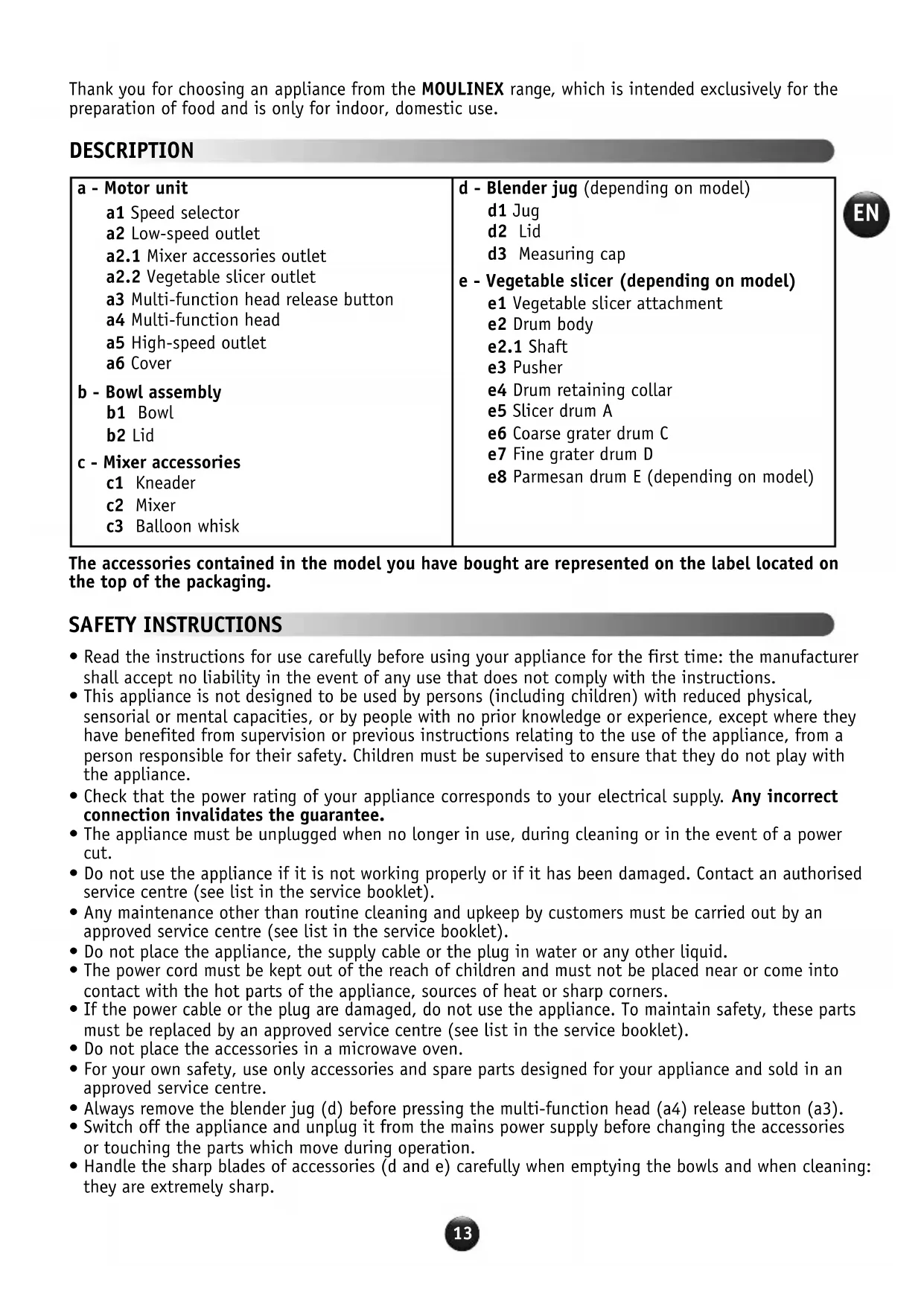 Thank you for choosing an appliance from the MOULINEX range, which is intended exclusively for the preparation of food and is only for indoor, domestic use.