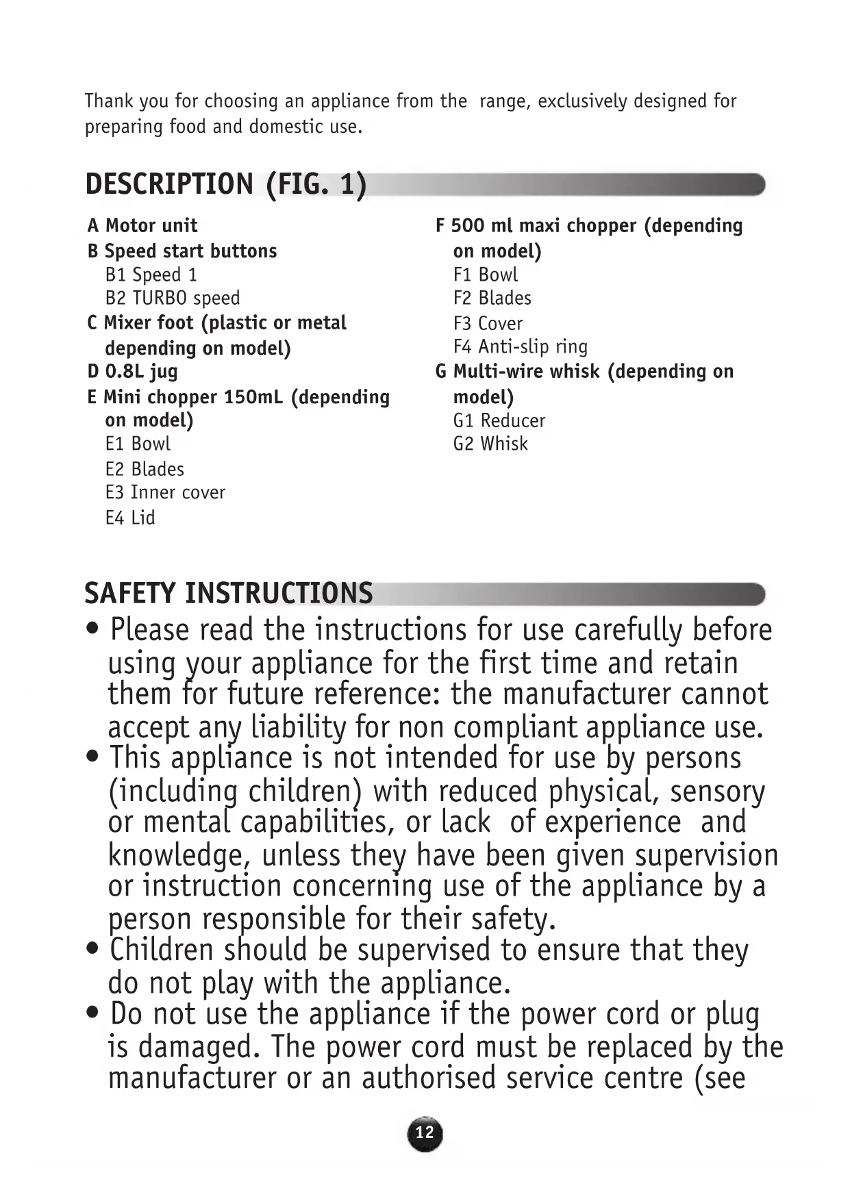 - Do not use the appliance if the power cord or plug is damaged. The power cord must be replaced by the manufacturer or an authorised service centre (see A Motor unit B Speed start buttons B1 Speed 1 B2 TURBO speed C Mixer foot (plastic or metal depending on model) D 0.8L jug E Mini chopper 150mL (depending on model) E1 Bowl E2 Blades E3 Inner cover E4 Lid F 500 ml maxi chopper (depending on model) F1 Bowl F2 Blades F3 Cover F4 Anti-slip ring G Multi-wire whisk (depending on model) G1 Reducer G2 Whisklist in the service booklet) in order to avoid danger.
