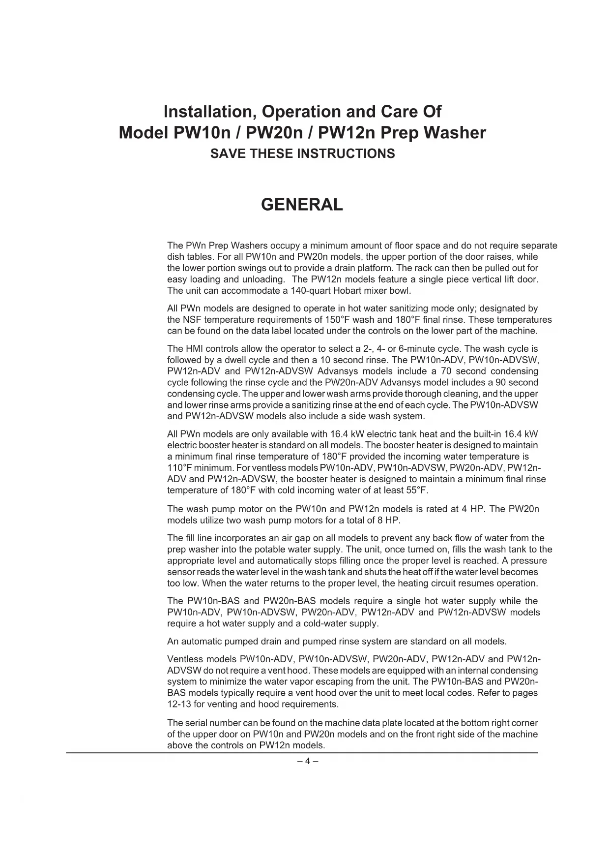 GENERAL ThePWnPrepWashersoccupyaminimumamountofoorspaceanddonotrequireseparate dish tables. For all PW10n and PW20n models, the upper portion of the door raises, while the lower portion swings out to provide a drain platform. The rack can then be pulled out for easy loading and unloading. The PW12n models feature a single piece vertical lift door. The unit can accommodate a 140-quart Hobart mixer bowl. All PWn models are designed to operate in hot water sanitizing mode only; designated by theNSFtemperaturerequirementsof150°Fwashand180°Fnalrinse.Thesetemperatures can be found on the data label located under the controls on the lower part of the machine. The HMI controls allow the operator to select a 2-, 4- or 6-minute cycle. The wash cycle is followed by a dwell cycle and then a 10 second rinse. The PW10n-ADV, PW10n-ADVSW, PW12n-ADV and PW12n-ADVSW Advansys models include a 70 second condensing cycle following the rinse cycle and the PW20n-ADV Advansys model includes a 90 second condensing cycle. The upper and lower wash arms provide thorough cleaning, and the upper and lower rinse arms provide a sanitizing rinse at the end of each cycle. The PW10n-ADVSW and PW12n-ADVSW models also include a side wash system. All PWn models are only available with 16.4 kW electric tank heat and the built-in 16.4 kW electric booster heater is standard on all models. The booster heater is designed to maintain aminimumnalrinsetemperatureof180°Fprovidedtheincomingwatertemperatureis 110°F minimum. For ventless models PW10n-ADV, PW10n-ADVSW, PW20n-ADV, PW12n- ADVandPW12n-ADVSW,theboosterheaterisdesignedtomaintainaminimumnalrinse temperature of 180°F with cold incoming water of at least 55°F. The wash pump motor on the PW10n and PW12n models is rated at 4 HP. The PW20n models utilize two wash pump motors for a total of 8 HP. Thelllineincorporatesanairgaponallmodelstopreventanybackowofwaterfromthe prepwasherintothepotablewatersupply.Theunit,onceturnedon,llsthewashtanktothe appropriatelevelandautomaticallystopsllingoncetheproperlevelisreached.Apressure sensor reads the water level in the wash tank and shuts the heat off if the water level becomes too low. When the water returns to the proper level, the heating circuit resumes operation. The PW10n-BAS and PW20n-BAS models require a single hot water supply while the PW10n-ADV, PW10n-ADVSW, PW20n-ADV, PW12n-ADV and PW12n-ADVSW models require a hot water supply and a cold-water supply. An automatic pumped drain and pumped rinse system are standard on all models. Ventless models PW10n-ADV, PW10n-ADVSW, PW20n-ADV, PW12n-ADV and PW12n- ADVSW do not require a vent hood. These models are equipped with an internal condensing system to minimize the water vapor escaping from the unit. The PW10n-BAS and PW20n- BAS models typically require a vent hood over the unit to meet local codes. Refer to pages 12-13 for venting and hood requirements. The serial number can be found on the machine data plate located at the bottom right corner of the upper door on PW10n and PW20n models and on the front right side of the machine above the controls on PW12n models.– 5 – INSTALLATION UNPACKING Immediately after unpacking the PWn Prep Washer, check for possible shipping damage. If the machine is found to be damaged, save the packaging material and contact the carrier within 5 business days after delivery. Priortoinstallation,testtheelectricalservicetoensurethatitagreeswiththespecications on the data plate located on the bottom right of the upper door (PW10n and PW20n models) or above the controls on the front right side of the machine (PW12n models). Unpacking From Pallet Carefully unpack the machine from the pallet.