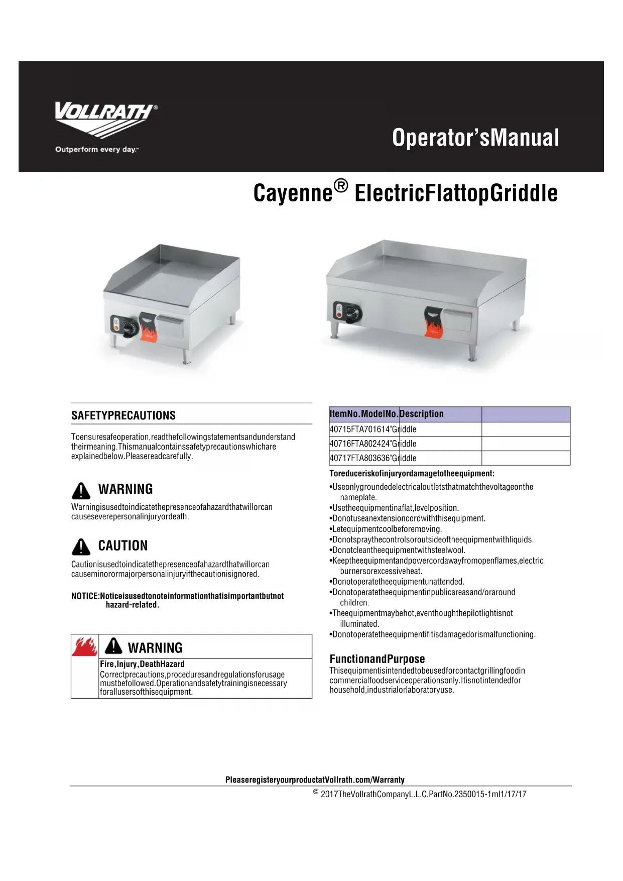 NOTICE: Do not allow the griddle to remain unseasoned or without a thin coating of cooking oil to prevent corrosion. CAUTION Burn Hazard Hot surfaces and food can burn skin. Allow the hot surfaces to cool before handling. Do not drop or spill water onto the cooking surface as it can spray or splatter. WARNING Electrical Shock Hazard Keep water and other liquids from entering the inside of the equipment. Liquid inside the equipment could cause an electrical shock. Do not spray water or cleaning products. Liquid could contact the electrical components and cause a short circuit or an electrical shock. CAUTION Burn Hazard Hot surfaces and food can burn skin. Allow the hot surfaces to cool before handling. Do not drop or spill water onto the cooking surface as it can spray or splatter.© 2017 The Vollrath Company L.L.C. Part No. 2350015-1 ml 1/17/17 The Vollrath Company, L.L.C. Headquarters 1236 North 18th Street Sheboygan, Wisconsin 53081-3201 USA Main Tel: 800-624-2051 or 920-457-4851 Main Fax: 800-752-5620 or 920-459-6573 Canada Customer Service: 800-695-8560 Tech Services: techservicereps@vollrathco.com www.vollrath.com Vollrath Europe BV Beneluxbaan 7 5121 AD RIJEN The Netherlands +31161870005 Vollrath of China Vollrath Shanghai Trading Limited 23A, Time Square Plaza | 500 Zhang Yang Road Pudong, Shanghai 200122 Tel: 86-21-50589580 Vollrath de Mexico S. de R.L. de C.V. Periferico Sur No. 7980 Edificio 4-E Col. Santa Maria Tequepexpan 45600 Tlaquepaque, Jalisco | Mexico Tel: (52) 333-133-6767 Tel: (52) 333-133-6769 Fax: (52) 333-133-6768 TROUBLESHOOTING