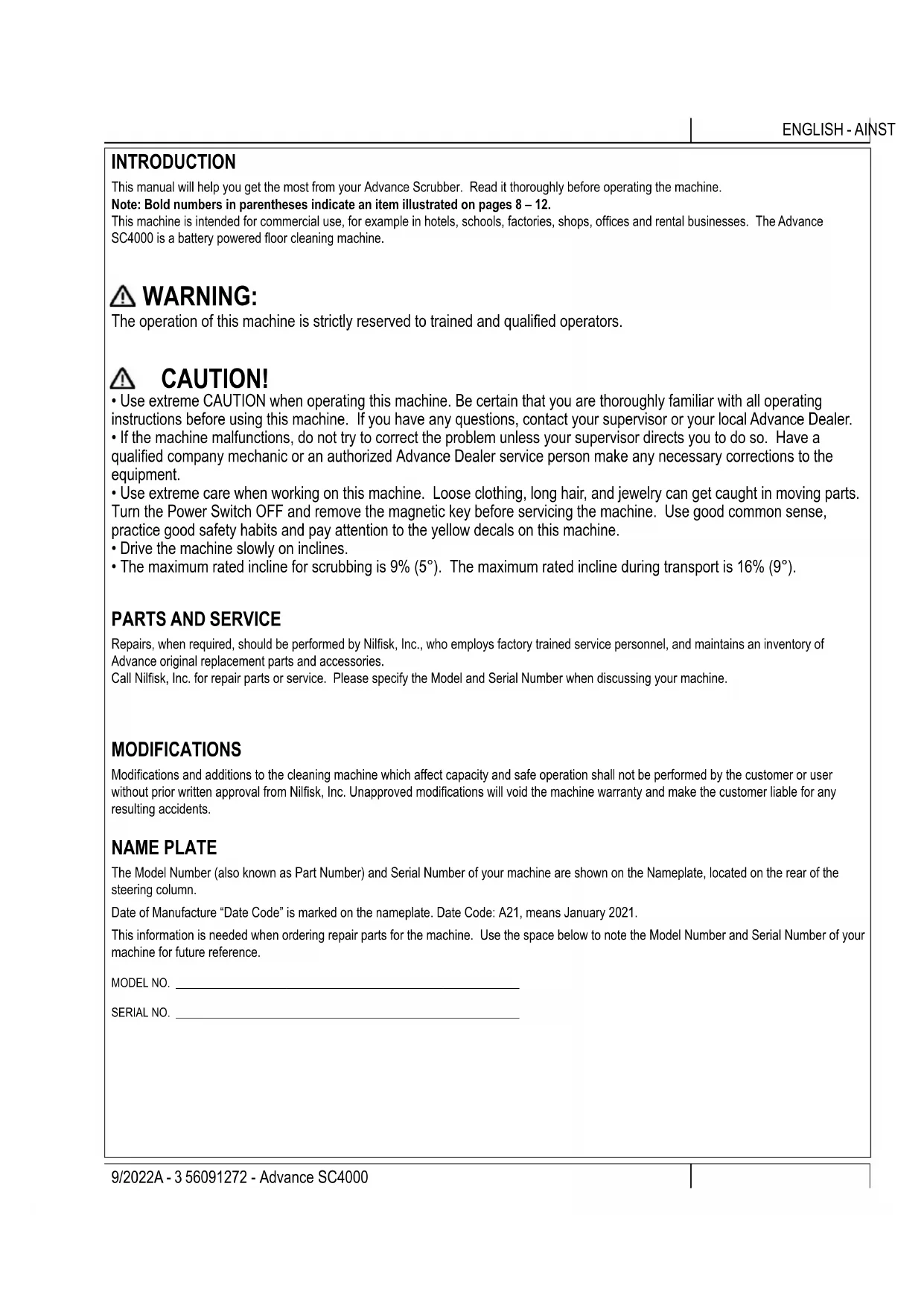 Repairs, when required, should be performed by Nilsk, Inc., who employs factory trained service personnel, and maintains an inventory of Advance original replacement parts and accessories. Call Nilsk, Inc. for repair parts or service. Please specify the Model and Serial Number when discussing your machine. MODIFICATIONS Modications and additions to the cleaning machine which affect capacity and safe operation shall not be performed by the customer or user without prior written approval from Nilsk, Inc. Unapproved modications will void the machine warranty and make the customer liable for any resulting accidents. NAME PLATE The Model Number (also known as Part Number) and Serial Number of your machine are shown on the Nameplate, located on the rear of the steering column. Date of Manufacture “Date Code” is marked on the nameplate. Date Code: A21, means January 2021. This information is needed when ordering repair parts for the machine. Use the space below to note the Model Number and Serial Number of your machine for future reference. MODEL NO. ___________________________________________________________ SERIAL NO. ___________________________________________________________A - 4 Advance SC4000 - 56091272 9/2022