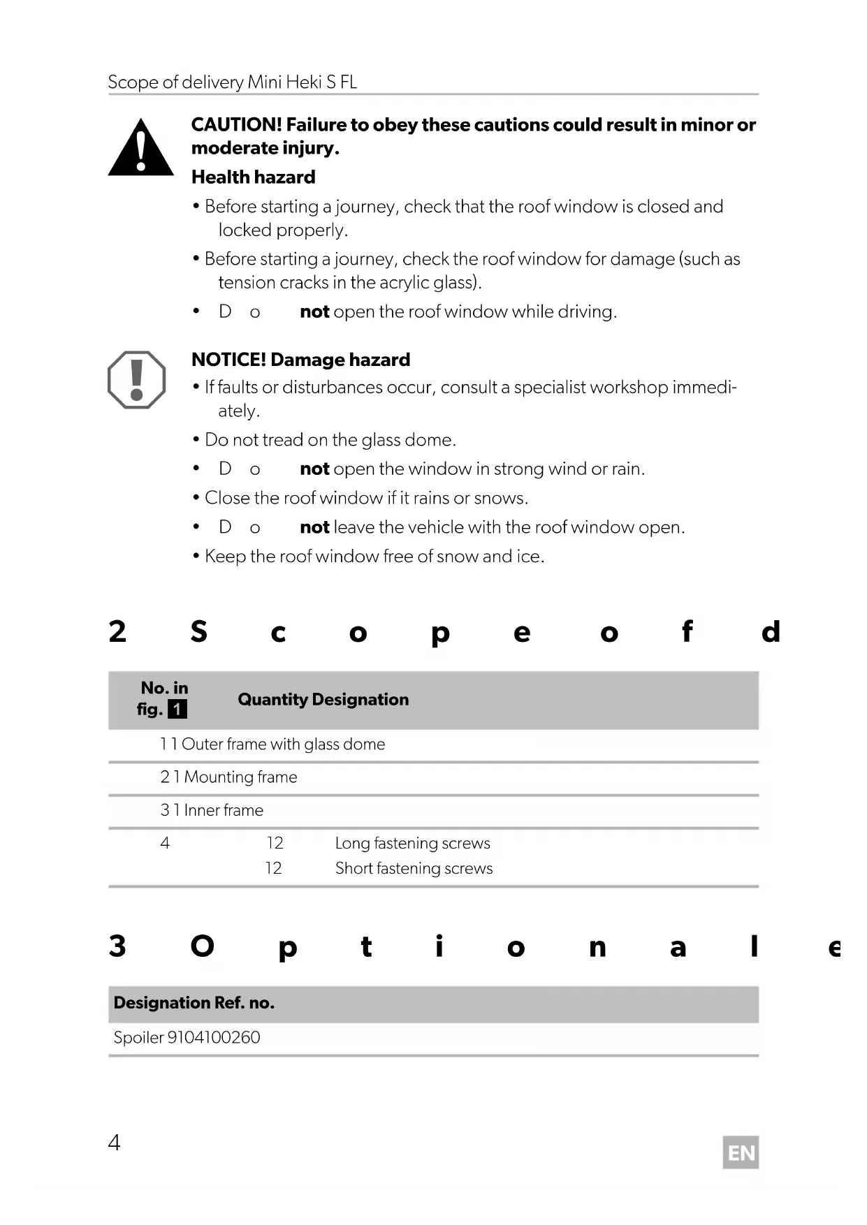 Long fastening screwsShort fastening screwsDesignation Ref. no.Spoiler 9104100260 DometicMiniHeki-S-FL_IOM_4445104092_EMEA24_202x-xx-xx.book Page 4 Thursday, July 6, 2023 2:00 PMEN Mini Heki S FL Intended use