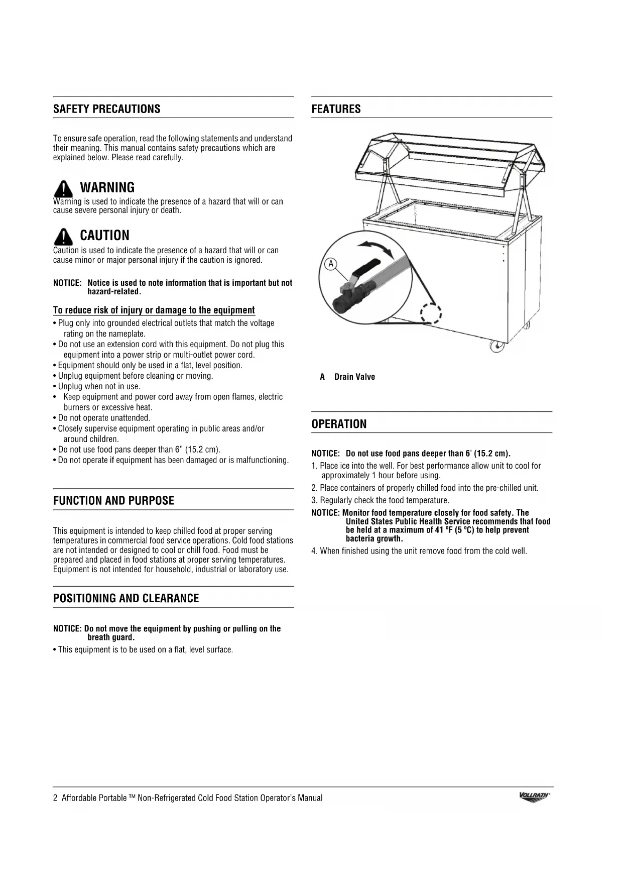 Drain Valve AAffordable Portable ™ Non-Refrigerated Cold Food Station Operator’s Manual 3 CLEANING To maintain the appearance and increase the service life, clean your equipment daily. NOTICE: Do not use caustic cleaning chemicals, steel wool or commercial lime removal products to clean the equipment. Thoroughly rinse equipment with water after cleaning.