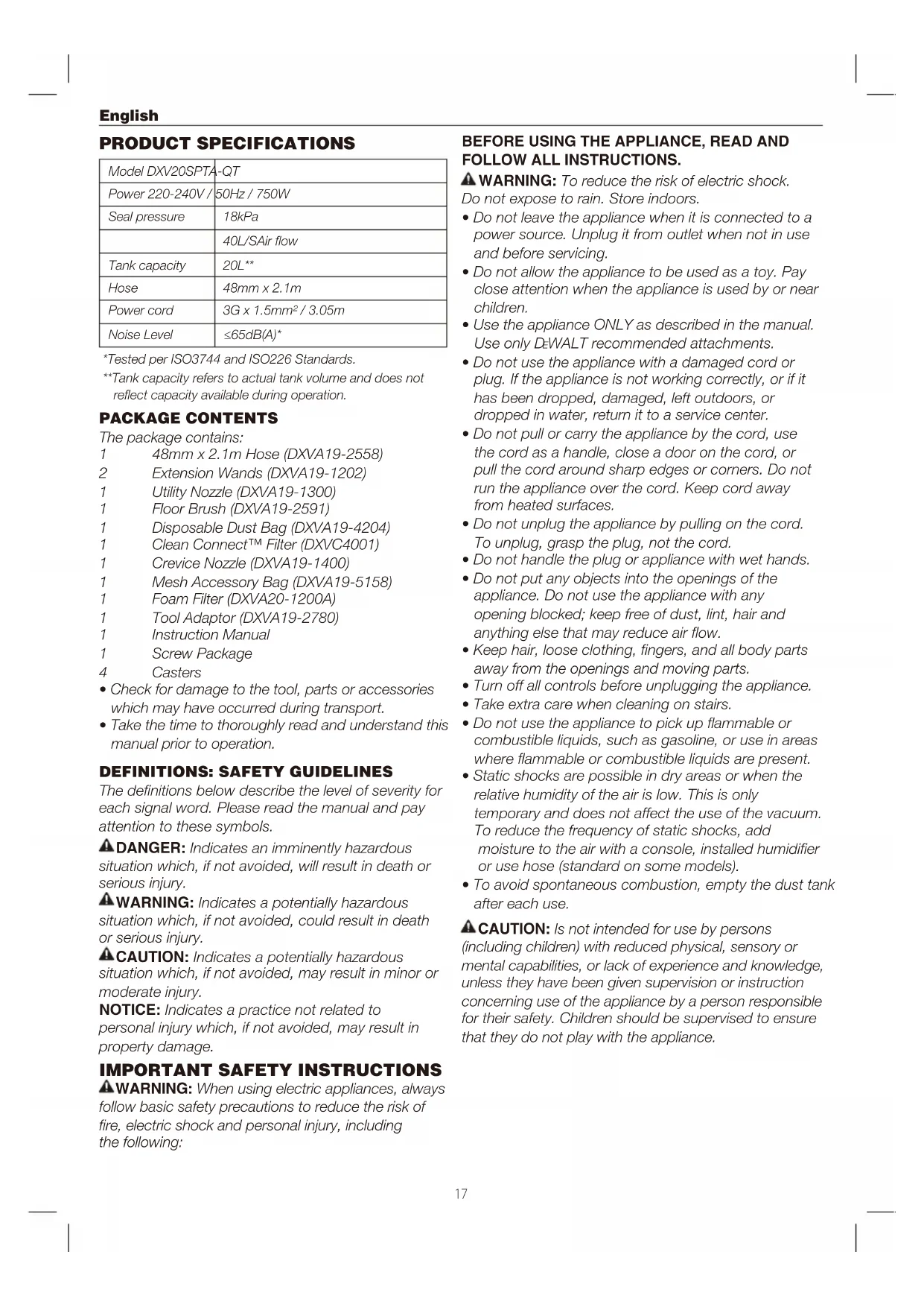Download the instructions for your Uncategorized in PDF format for free! Find your manual DXV20SPTAQT - DEWALT and take your electronic device back in hand. On this page are published all the documents necessary for the use of your device. DXV20SPTAQT by DEWALT.