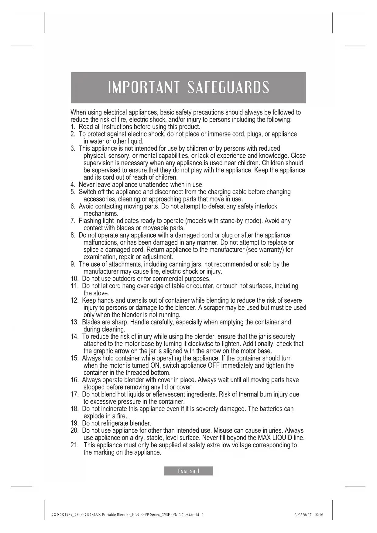 - Removable rechargeable lithium-ion battery (See disclaimer in “Instructions for Replacing the Battery” section) Before you use the appliance for the first time, separate the sip lid and jar from the motor base. Handwash the sip lid, flat lid, and jar in warm, soapy water. Rinse and dry well. CAUTION: TO AVOID ACCIDENTALLY PRESSING THE POWER AND START BUTTONS DURING CLEANING, DO NOT CLEAN THE INSIDE OF JAR WHEN IT IS FIXED ON THE MOTOR BASE. CLEANING THE JAR WHILE IT IS ON THE BASE COULD RESULT IN INJURIES FROM THE SHARP BLADES. NOTE: The jar and flat lid are dishwasher safe (on the top rack), but the sip lid is NOT dishwasher safe. CAUTION: THE BLADES ARE SHARP. HANDLE CAREFULLY, ESPECIALLY WHEN CLEANING. NOTE: For easy cleaning, add 3-5 drops soap and 4-8 oz/120-240 ml cool water to the jar and run a blending cycle immediately after use to prevent food particles from drying and sticking. CAUTION: DO NOT BLEND DRY HARD INGREDIENTS LIKE DRY CORN KERNELS, AS IT MAY DAMAGE THE BLADES. COOK1989_Oster GOMAX Portable Blender_BLSTGFP Series_25SEFPM2 (LA).indd 6COOK1989_Oster GOMAX Portable Blender_BLSTGFP Series_25SEFPM2 (LA).indd 6 2025/6/27 10:162025/6/27 10:16English-7