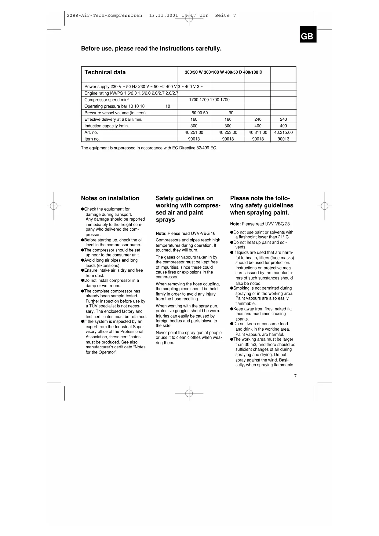 Operating pressure bar 10 10 10 10 Pressure vessel volume (in liters) 50 90 50 90 Effective delivery at 6 bar l/min. 160 160 240 240 Induction capacity l/min. 300 300 400 400 Art. no. 40.251.00 40.253.00 40.311.00 40.315.00 Itern no. 90013 90013 90013 90013 The equipment is suppressed in accordance with EC Directive 82/499 EC. Notes on installation ● Check the equipment for damage during transport. Any damage should be reported immediately to the freight com- pany who delivered the com- pressor. ● Before starting up, check the oil level in the compressor pump. ● The compressor should be set up near to the consumer unit. ● Avoid long air pipes and long leads (extensions). ● Ensure intake air is dry and free from dust. ● Do not install compressor in a damp or wet room. ● The complete compressor has already been sample-tested. Further inspection before use by a TÜV specialist is not neces- sary. The enclosed factory and test certificates must be retained. ● If the system is inspected by an expert from the Industrial Super- visory office of the Professional Association, these certificates must be produced. See also manufacturer’s certificate “Notes for the Operator”. 2288-Air-Tech-Kompressoren 13.11.2001 14:17 Uhr Seite 78