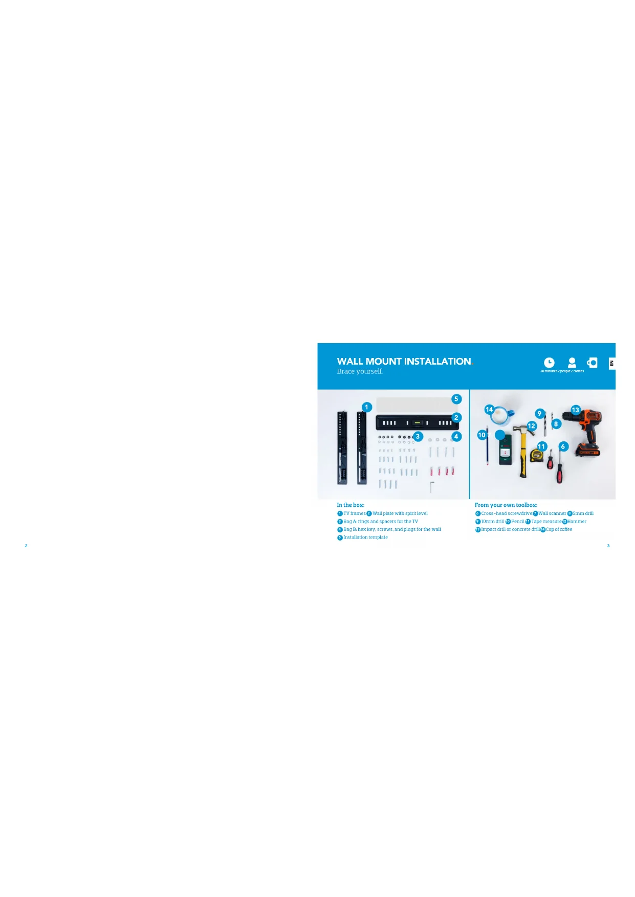 Installation template WALL MOUNT INSTALLATION. Brace yourself. 30 minutes 2 people 2 coffees From your own toolbox:
