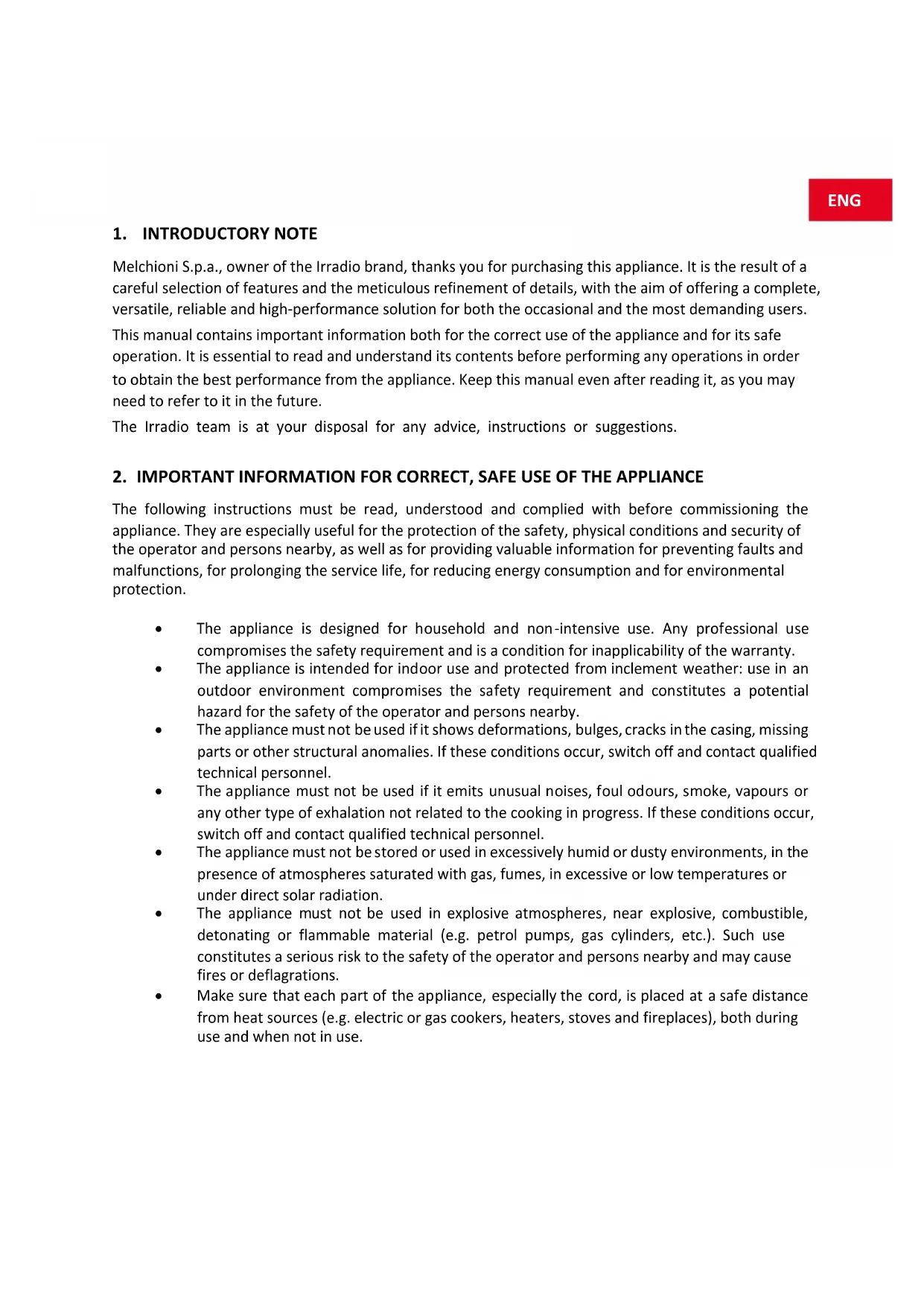- Make sure that each part of the appliance, especially the cord, is placed at a safe distance from heat sources (e.g. electric or gas cookers, heaters, stoves and fireplaces), both during use and when not in use. ENG• During use, the appliance must be constantly supervised: do not use it in the absence of operators or persons who are able to constantly check its correct operation.