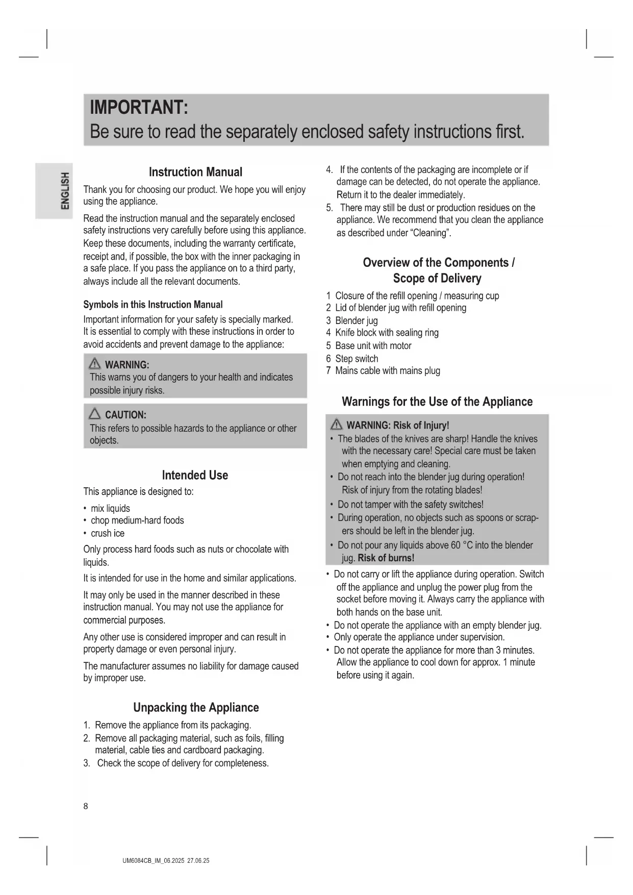 Troubleshooting Problem Possible Cause Remedy The appliance has no function. The appliance has no power supply. Check the power socket with another appliance. Insert the mains plug correctly. Check the house fuse. Wrong switch position. Check the position of the step switch. Your appliance is provided with a safety switch. It prevents the motor from starting up uninten- tionally. Check that the blender jug and the blender jug lid are correctly in place. The appliance is defective. Contact our service or a specialist. Technical Data Model:.................................................................UM 6084 CB Power supply:......................................220 – 240 V~, 50 / 60 Hz Power consumption: .....................................................700 W Declared standby-mode power: ..................................< 0.3 W Protection class: ................................................................... Filling quantity: ................................................. max. 1.5 litres Net weight: ....................................................... approx. 2.8 kg The right to make technical and design modications in the course of continuous product development remains reserved. This appliance has been tested according to all applicable, current CE directives and built according to the latest safety regulations. Disposal Meaning of the “Dustbin” Symbol Protect our environment: do not dispose of elec- trical equipment in the domestic waste. Please return any electrical equipment that you will no longer use to the collection points provided for their disposal. This helps avoid the potential effects of incorrect disposal on the environment and human health. This will contribute to the recycling and other forms of re-utilisation of electrical and electronic equipment. Information concerning where the equipment can be disposed of can be obtained from your local authority. Your dealer and contractual partner is also obliged to take back the old appliance free of charge.UM6084CB_IM_06.2025 27.06.25