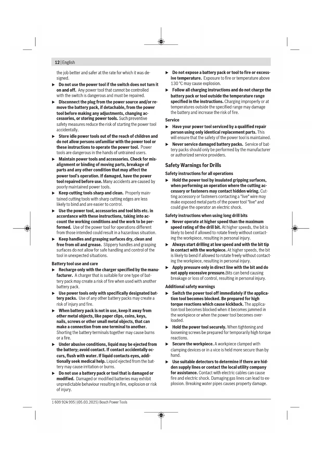 äußeren Abmessung größer als 25cm sind, im Einzel- handelsgeschäft oder in unmittelbarer Nähe hierzu un- entgeltlich zurückzunehmen; die Rücknahme darf nicht an den Kauf eines Elektro- oder Elektronikgerätes ge- knüpft werden und ist auf drei Altgeräte pro Geräteart beschränkt. Der Vertreiber hat beim Abschluss des Kaufvertrags für das neue Elektro- oder Elektronikgerät den Endnutzer über die Möglichkeit zur unentgeltlichen Rückgabe bzw. Abholung 1 609 92A 995 | (05.03.2025) Bosch Power ToolsEnglish | 11 des Altgeräts zu informieren und den Endnutzer nach seiner Absicht zu befragen, ob bei der Auslieferung des neuen Ge- räts ein Altgerät zurückgegeben wird. Dies gilt auch bei Vertrieb unter Verwendung von Fernkom- munikationsmitteln, wenn die Lager- und Versandflächen für Elektro- und Elektronikgeräte mindestens 400m² betragen oder die gesamten Lager- und Versandflächen mindestens 800m² betragen, wobei die unentgeltliche Abholung auf Elektro- und Elektronikgeräte der Kategorien 1 (Wärmeüber- träger), 2 (Bildschirmgeräte) und 4 (Großgeräte mit mindes- tens einer äußeren Abmessung über 50cm) beschränkt ist. Für alle übrigen Elektro- und Elektronikgeräte muss der Ver- treiber geeignete Rückgabemöglichkeiten in zumutbarer Ent- fernung zum jeweiligen Endnutzer gewährleisten; das gilt auch für Altgeräte, die in keiner äußeren Abmessung größer als 25cm sind, die der Endnutzer zurückgeben will, ohne ein neues Gerät zu kaufen. English Safety Instructions General Power Tool Safety Warnings WARNING Read all safety warnings, instruc- tions, illustrations and specifica- tions provided with this power tool. Failure to follow all in- structions listed below may result in electric shock, fire and/ or serious injury. Save all warnings and instructions for future reference. The term "power tool" in the warnings refers to your mains- operated (corded) power tool or battery-operated (cord- less) power tool. Work area safety u Keep work area clean and well lit. Cluttered or dark areas invite accidents. u Do not operate power tools in explosive atmospheres, such as in the presence of flammable liquids, gases or dust. Power tools create sparks which may ignite the dust or fumes. u Keep children and bystanders away while operating a power tool. Distractions can cause you to lose control. Electrical safety u Power tool plugs must match the outlet. Never modify the plug in any way. Do not use any adapter plugs with earthed (grounded) power tools. Unmodified plugs and matching outlets will reduce risk of electric shock. u Avoid body contact with earthed or grounded sur- faces, such as pipes, radiators, ranges and refrigerat- ors. There is an increased risk of electric shock if your body is earthed or grounded. u Do not expose power tools to rain or wet conditions. Water entering a power tool will increase the risk of elec- tric shock. u Do not abuse the cord. Never use the cord for carry- ing, pulling or unplugging the power tool. Keep cord away from heat, oil, sharp edges or moving parts. Damaged or entangled cords increase the risk of electric shock. u When operating a power tool outdoors, use an exten- sion cord suitable for outdoor use. Use of a cord suit- able for outdoor use reduces the risk of electric shock. u If operating a power tool in a damp location is un- avoidable, use a residual current device (RCD) protec- ted supply. Use of an RCD reduces the risk of electric shock. Personal safety u Stay alert, watch what you are doing and use common sense when operating a power tool. Do not use a power tool while you are tired or under the influence of drugs, alcohol or medication. A moment of inatten- tion while operating power tools may result in serious per- sonal injury. u Use personal protective equipment. Always wear eye protection. Protective equipment such as a dust mask, non-skid safety shoes, hard hat or hearing protection used for appropriate conditions will reduce personal in- juries. u Prevent unintentional starting. Ensure the switch is in the off-position before connecting to power source and/or battery pack, picking up or carrying the tool. Carrying power tools with your finger on the switch or en- ergising power tools that have the switch on invites acci- dents. u Remove any adjusting key or wrench before turning the power tool on. A wrench or a key left attached to a rotating part of the power tool may result in personal in- jury. u Do not overreach. Keep proper footing and balance at all times. This enables better control of the power tool in unexpected situations. u Dress properly. Do not wear loose clothing or jew- ellery. Keep your hair and clothing away from moving parts. Loose clothes, jewellery or long hair can be caught in moving parts. u If devices are provided for the connection of dust ex- traction and collection facilities, ensure these are con- nected and properly used. Use of dust collection can re- duce dust-related hazards. u Do not let familiarity gained from frequent use of tools allow you to become complacent and ignore tool safety principles. A careless action can cause severe in- jury within a fraction of a second. Power tool use and care u Do not force the power tool. Use the correct power tool for your application. The correct power tool will do Bosch Power Tools 1 609 92A 995 | (05.03.2025)12 | English the job better and safer at the rate for which it was de- signed. u Do not use the power tool if the switch does not turn it on and off. Any power tool that cannot be controlled with the switch is dangerous and must be repaired. u Disconnect the plug from the power source and/or re- move the battery pack, if detachable, from the power tool before making any adjustments, changing ac- cessories, or storing power tools. Such preventive safety measures reduce the risk of starting the power tool accidentally. u Store idle power tools out of the reach of children and do not allow persons unfamiliar with the power tool or thes