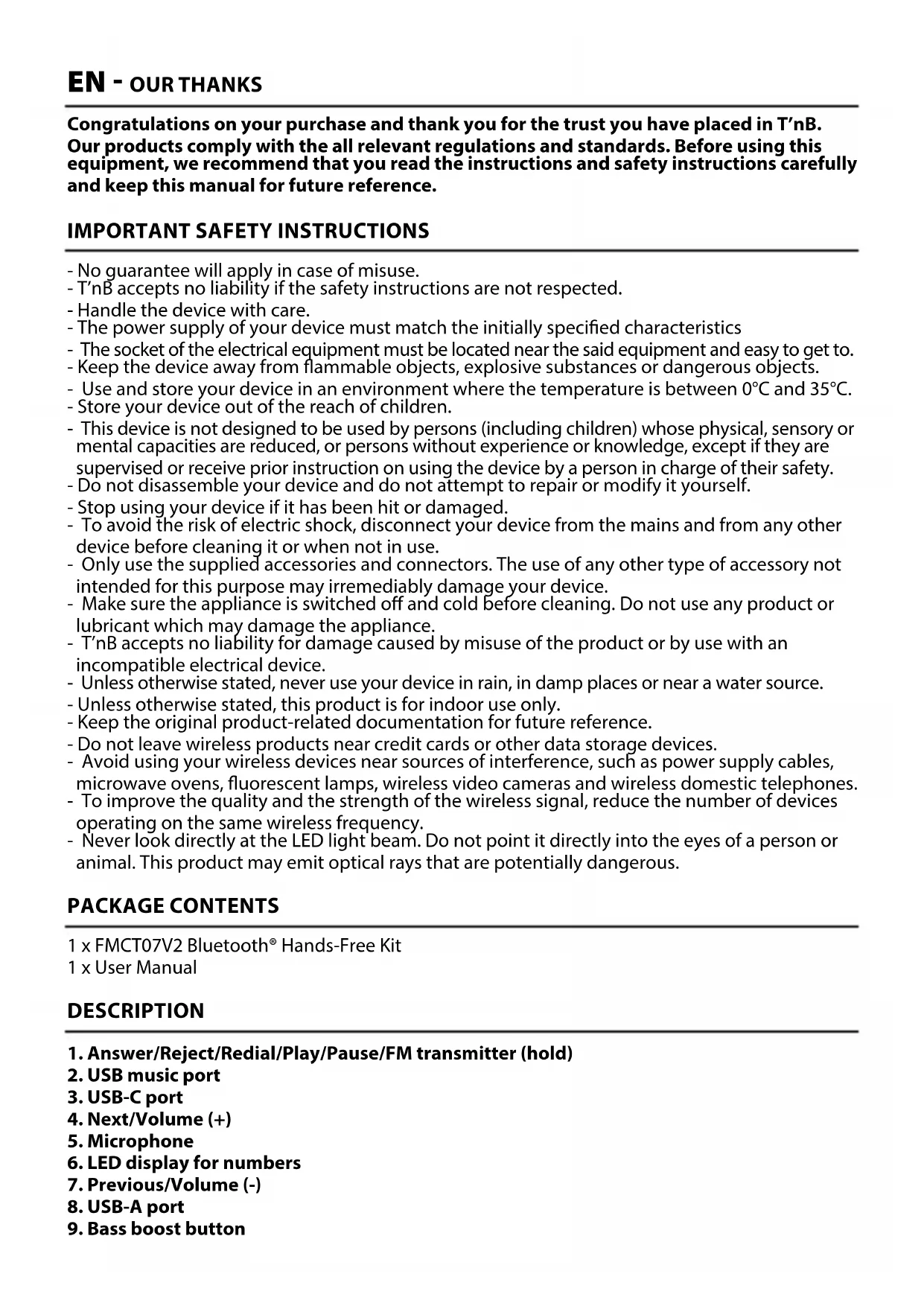 - No guarantee will apply in case of misuse. - T’nB accepts no liability if the safety instructions are not respected. - Handle the device with care. - The power supply of your device must match the initially specied characteristics - The socket of the electrical equipment must be located near the said equipment and easy to get to. - Keep the device away from ammable objects, explosive substances or dangerous objects. - Use and store your device in an environment where the temperature is between 0°C and 35°C. - Store your device out of the reach of children. - This device is not designed to be used by persons (including children) whose physical, sensory or mental capacities are reduced, or persons without experience or knowledge, except if they are supervised or receive prior instruction on using the device by a person in charge of their safety. - Do not disassemble your device and do not attempt to repair or modify it yourself. - Stop using your device if it has been hit or damaged. - To avoid the risk of electric shock, disconnect your device from the mains and from any other device before cleaning it or when not in use. - Only use the supplied accessories and connectors. The use of any other type of accessory not intended for this purpose may irremediably damage your device. - Make sure the appliance is switched o and cold before cleaning. Do not use any product or lubricant which may damage the appliance. - T’nB accepts no liability for damage caused by misuse of the product or by use with an incompatible electrical device. - Unless otherwise stated, never use your device in rain, in damp places or near a water source. - Unless otherwise stated, this product is for indoor use only. - Keep the original product-related documentation for future reference. - Do not leave wireless products near credit cards or other data storage devices. - Avoid using your wireless devices near sources of interference, such as power supply cables, microwave ovens, uorescent lamps, wireless video cameras and wireless domestic telephones. - To improve the quality and the strength of the wireless signal, reduce the number of devices operating on the same wireless frequency. - Never look directly at the LED light beam. Do not point it directly into the eyes of a person or animal. This product may emit optical rays that are potentially dangerous. PACKAGE CONTENTS 1 x FMCT07V2 Bluetooth® Hands-Free Kit 1 x User Manual DESCRIPTION