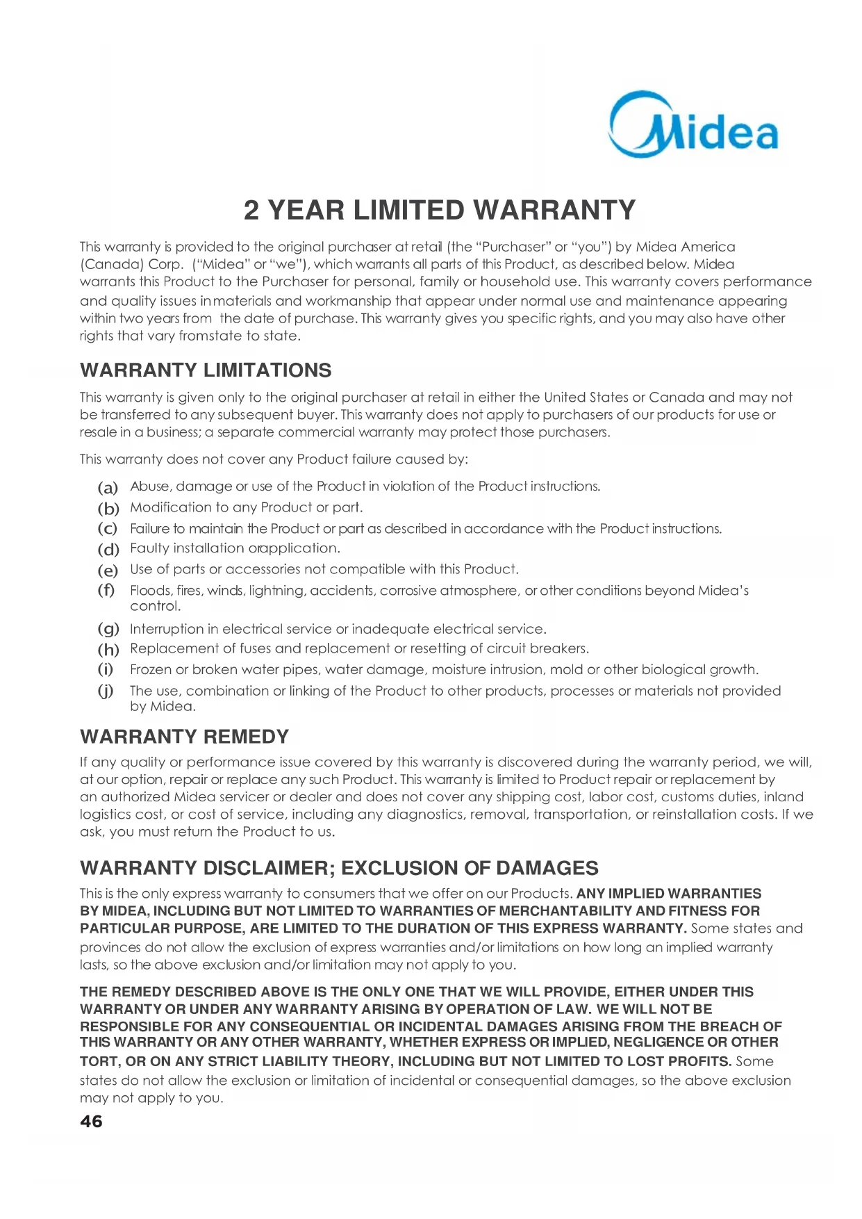 WARRANTY LIMITATIONS This warranty is given only to the original purchaser at retail in either the United States or Canada and may not be transferred to any subsequent buyer. This warranty does not apply to purchasers of our products for use or resale in a business; a separate commercial warranty may protect those purchasers. This warranty does not cover any Product failure caused by: (a) Abuse, damage or use of the Product in violation of the Product instructions. (b) Modification to any Product or part. (c) Failure to maintain the Product or part as described in accordance with the Product instructions. (d) Faulty installation or application. (e) Use of parts or accessories not compatible with this Product. (f) Floods, fires, winds, lightning, accidents, corrosive atmosphere, or other conditions beyond Midea’s control. (g) Interruption in electrical service or inadequate electrical service. (h) Replacement of fuses and replacement or resetting of circuit breakers. (i) Frozen or broken water pipes, water damage, moisture intrusion, mold or other biological growth. (j) The use, combination or linking of the Product to other products, processes or materials not provided by Midea. WARRANTY REMEDY If any quality or performance issue covered by this warranty is discovered during the warranty period, we will, at our option, repair or replace any such Product. This warranty is limited to Product repair or replacement by an authorized Midea servicer or dealer and does not cover any shipping cost, labor cost, customs duties, inland logistics cost, or cost of service, including any diagnostics, removal, transportation, or reinstallation costs. If we ask, you must return the Product to us.