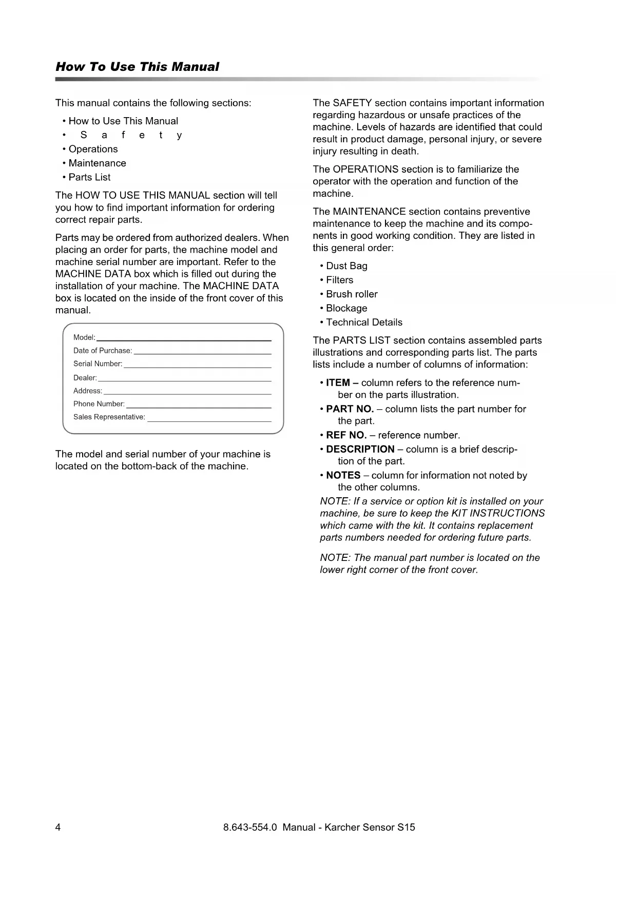 - NOTES – column for information not noted by the other columns. NOTE: If a service or option kit is installed on your machine, be sure to keep the KIT INSTRUCTIONS which came with the kit. It contains replacement parts numbers needed for ordering future parts. NOTE: The manual part number is located on the lower right corner of the front cover. Model: Date of Purchase: Serial Number: Dealer: Address: Phone Number: Sales Representative: 8.643-554.0 Manual - Karcher Sensor S155 Safety