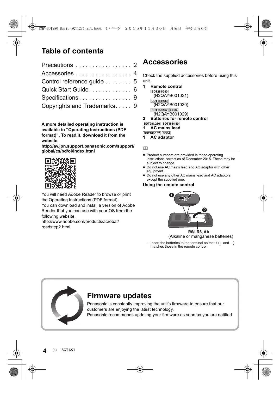 R6/LR6, AA (Alkaline or manganese batteries) – Insert the batteries to the terminal so that it (i and j) matches those in the remote control. Firmware updates Panasonic is constantly improving the unit’s firmware to ensure that our customers are enjoying the latest technology. Panasonic recommends updating your firmware as soon as you are notified.