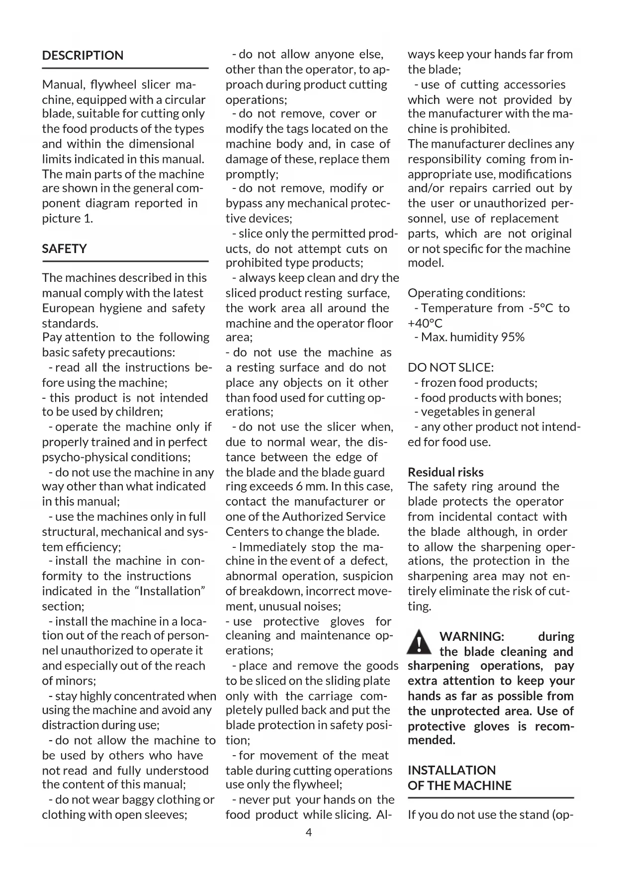 jury from sharp blade! The blade replacement is mandatory if distance be- tween the edge of the blade and the internal edge of the guard exceeds 6 mm. WARRANTY AND RESPONSIBILITY The manufacturer supplies The manufacturer supplies ma- chines with a limited war-ranty of 24 months from the pur- chasing date. The warran-ty is extended only to defects that arise under intended use condi- tions and proper use. The war- ranty does not cover defects resulting from faults caused by transport, purchas-er’s incom- petence or negligence, improp- er installation, unauthorised interventions, natural wear and tear greater than 10% of the nominal value. More-over, the warranty does not cover components intrinsically sub- ject to wear, such as blades and grinders, except in the event of evident manufactur-ing de- fects. The manufacturer declines any direct and indirect responsibil- ity coming from: - failure to observe the instruc- tions in this manual; - use which does not conform to prevailing specic regula- tions in the country of instal- lation; - unauthorized modications and/or repairs carried out on the machine; - use of non-original accesso- ries and replacement parts; - exceptional events. Transfer of ownership of the machine automatically de- faults the manufacturer’s lia- bility for the machine in ques- tion. The Identication tag on the base-plate indicates manufac- turer, machine, technical infor- mation.