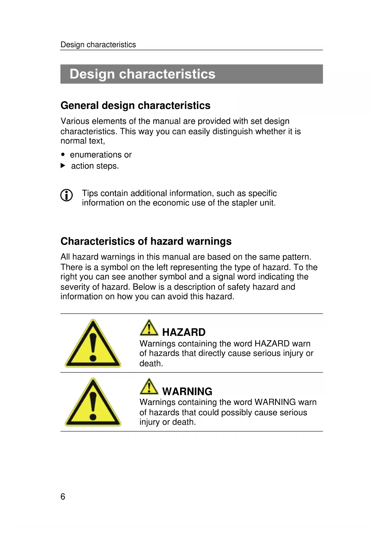 Design characteristics General design characteristics Various elements of the manual are provided with set design characteristics. This way you can easily distinguish whether it is normal text, enumerations or action steps.