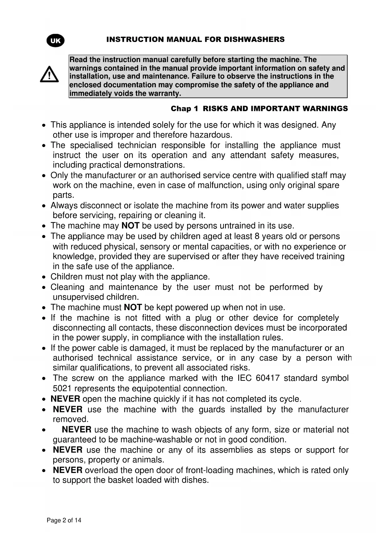 Read the instruction manual carefully before starting the machine. The warnings contained in the manual provide important information on safety and installation, use and maintenance. Failure to observe the instructions in the enclosed documentation may compromise the safety of the appliance and immediately voids the warranty. Chap 1 RISKS AND IMPORTANT WARNINGS This appliance is intended solely for the use for which it was designed. Any other use is improper and therefore hazardous. The specialised technician responsible for installing the appliance must instruct the user on its operation and any attendant safety measures, including practical demonstrations. Only the manufacturer or an authorised service centre with qualified staff may work on the machine, even in case of malfunction, using only original spare parts. Always disconnect or isolate the machine from its power and water supplies before servicing, repairing or cleaning it. The machine may NOT be used by persons untrained in its use. The appliance may be used by children aged at least 8 years old or persons with reduced physical, sensory or mental capacities, or with no experience or knowledge, provided they are supervised or after they have received training in the safe use of the appliance. Children must not play with the appliance. Cleaning and maintenance by the user must not be performed by unsupervised children. The machine must NOT be kept powered up when not in use. If the machine is not fitted with a plug or other device for completely disconnecting all contacts, these disconnection devices must be incorporated in the power supply, in compliance with the installation rules. If the power cable is damaged, it must be replaced by the manufacturer or an authorised technical assistance service, or in any case by a person with similar qualifications, to prevent all associated risks. The screw on the appliance marked with the IEC 60417 standard symbol 5021 represents the equipotential connection. NEVER open the machine quickly if it has not completed its cycle. NEVER use the machine with the guards installed by the manufacturer removed. NEVER use the machine to wash objects of any form, size or material not guaranteed to be machine-washable or not in good condition. NEVER use the machine or any of its assemblies as steps or support for persons, property or animals. NEVER overload the open door of front-loading machines, which is rated only to support the basket loaded with dishes.INSTRUCTION MANUAL FOR DISHWASHERS Page 3 of 14