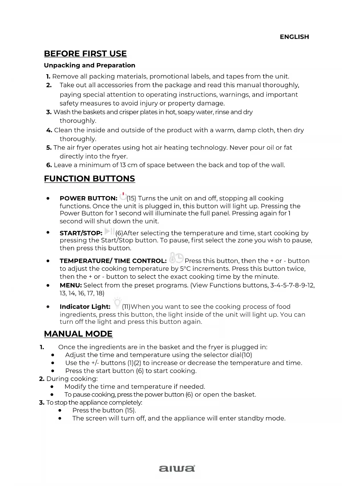 Indicator Light: (11)When you want to see the cooking process of food ingredients, press this button, the light inside of the unit will light up. You can turn off the light and press this button again. MANUAL MODE