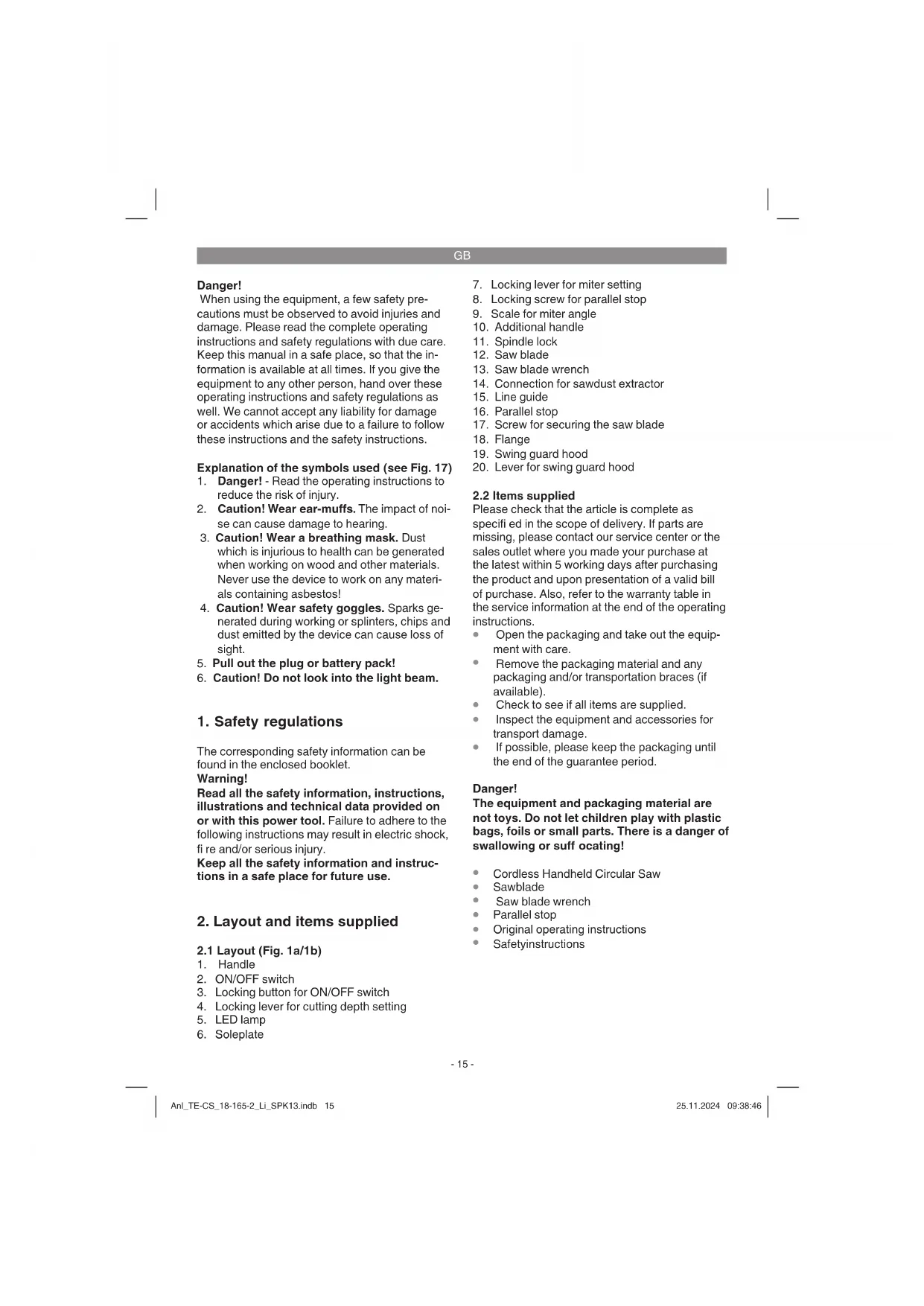 Danger! When using the equipment, a few safety pre- cautions must be observed to avoid injuries and damage. Please read the complete operating instructions and safety regulations with due care. Keep this manual in a safe place, so that the in- formation is available at all times. If you give the equipment to any other person, hand over these operating instructions and safety regulations as well. We cannot accept any liability for damage or accidents which arise due to a failure to follow these instructions and the safety instructions. Explanation of the symbols used (see Fig. 17)
