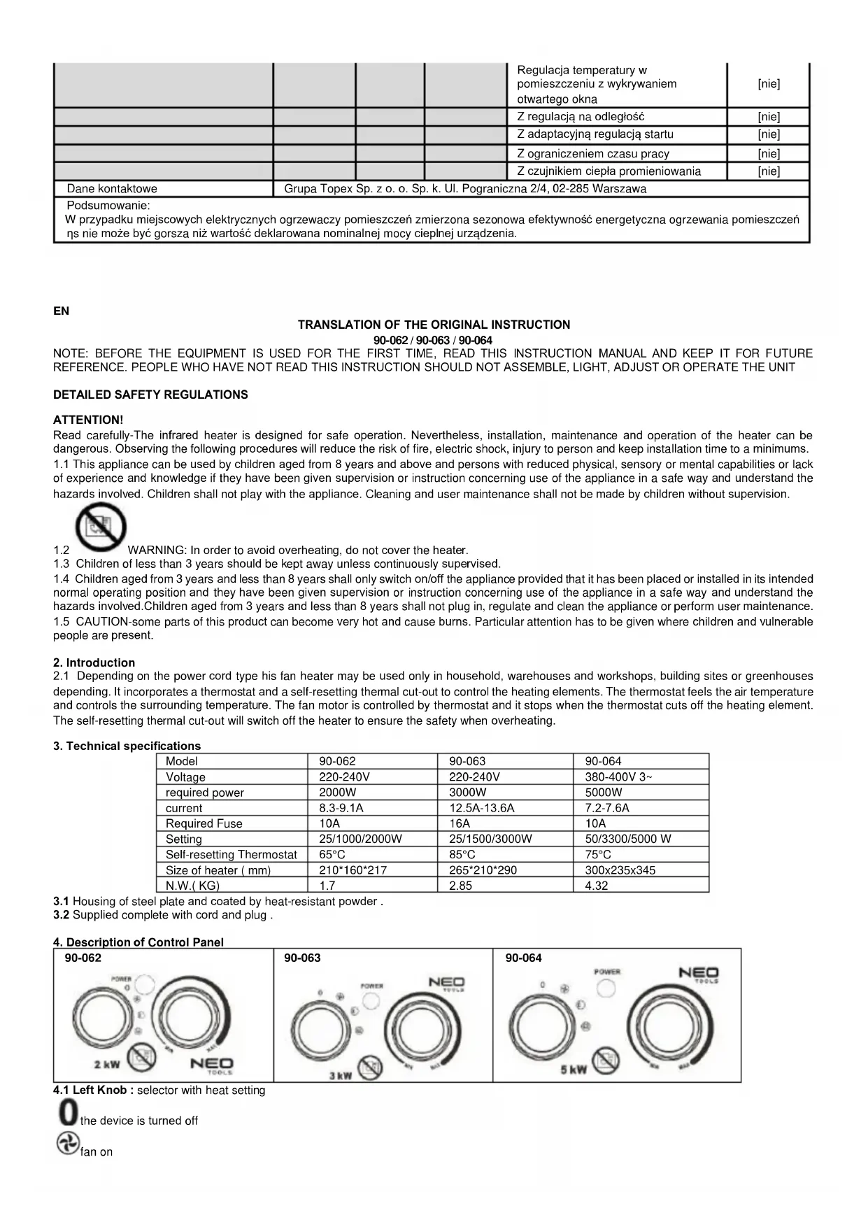 With black bulb sensor [no] Contact details: Grupa Topex Sp. z o. o. Sp. k. Ul. Pograniczna 2/4, 02-285 Warszawa Remark: For electric local space heaters, the measured seasonal space heating energy efficiency ηs cannot be worse than the declared value at the nominal heat output of the unit.