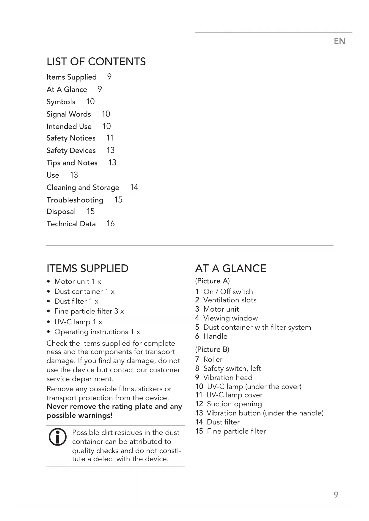 TROUBLESHOOTING If the device does not work properly, check whether you are able to rectify the problem yourself. If the problem cannot be solved with the steps below, contact the customer service department. Do not attempt to repair an electrical device yourself! The device generates no suction. The mains plug is not inserted correctly in the plug socket. ► Correct the fit. The device is not switched on. ► Press the On / Off switch. Low suction force. The dust container is too full. ► Empty the dust container. The filters are dirty. ► Clean the filters. The suction opening is blocked. ► Switch off the device, pull the mains plug out of the plug socket and remove the blockage. The UV-C lamp does not light up. The automatic switch-off function of the UV-C lamp has been activated. ► Check the safety switches (see the “Safety Devices” chapter). The vibration head does not vibrate. The vibrating function has not been switched on. ► Press the vibration button. Unusual odour The device is being used for the first time. ► A new odour is normal when the device is used for the first time; it disappears after a while. DISPOSAL Please Note! ■ The UV-C lamp should be removed prior to disposal of the device and disposed of separately from the device. Notes on how to remove the UV-C lamp can be found in the “Cleaning and Storage” chapter – “Cleaning the UV-C Lamp”. Dispose of the packaging material in an environmentally friendly manner so that it can be recycled. The adjacent symbol (crossed-out bin underlined) means that used devices should not be disposed of in the domestic waste, but should instead be taken to special collec- tion and return systems. Owners of used devices from private households can take them free of charge to the collection points of the public waste disposal authorities or the disposal points which are set up by manufacturers and distributors under the Electrical Equipment Act so that they can be disposed of in an environmen- tally friendly way and valuable raw materials can be recovered. If they are not disposed of properly, toxic ingredients may escape into the environment and cause harm to the health of humans, animals and plants. Businesses which market electrical and electronic devices are also obliged to take back used devices. Waste prevention makes an even more valuable contribution to protecting the environment. This means if possible, as well as continuing to use or repair a device yourself, passing it on to another user also represents an ecologically beneficial alternative to disposal.EN
