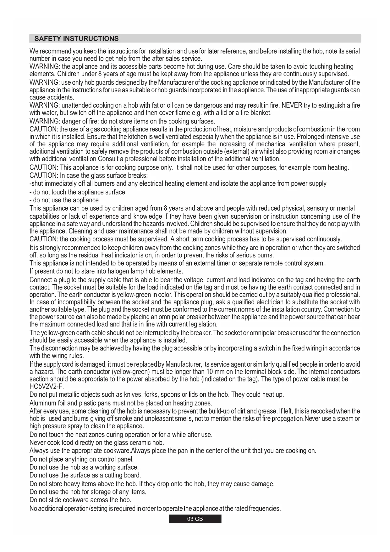 1480003 GB SAFETY INSTURUCTIONS We recommend you keep the instructions for installation and use for later reference, and before installing the hob, note its serial number in case you need to get help from the after sales service.