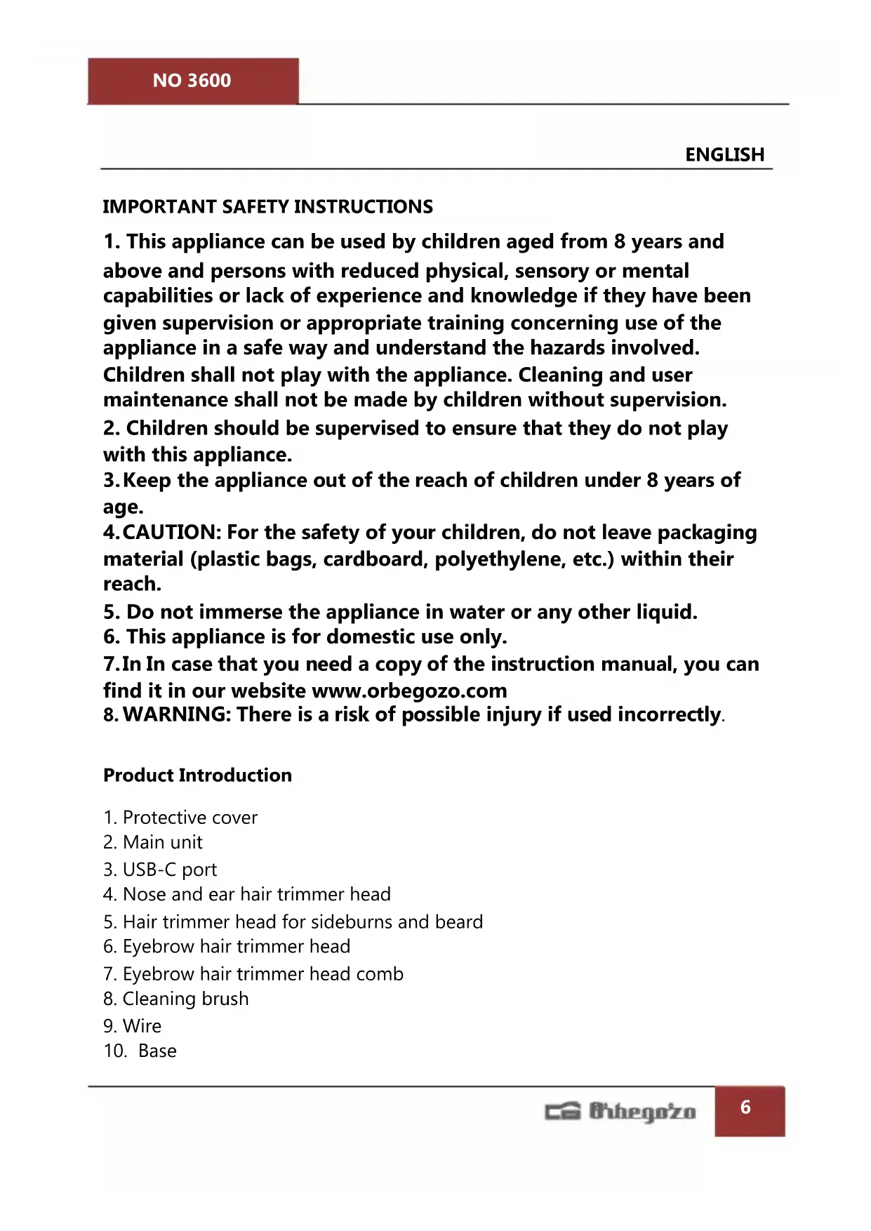 DECLARATION OF CONFORMITY: This device complies with the requirements of the Low Voltage Directive 2014/35/EU and the requirements of the EMC directive 2014/30/EU. GUARANTEE This appliance is covered and is entitled to the legal guarantee in accordance with the legislation in force from the date of purchase. Keep the purchase receipt to be able to claim your right to the guarantee. To find the closest service to your location, contact through the following web link: https://orbegozo.com/asistencia-tecnica/ For any type of query, doubt or incident, you can contact us through our email shown on the main page of this manual or through our technical assistance service at https://orbegozo.com/contacto/ Orbegozo is not responsible for components and accessories that are subject to wear and tear due to use, as well as perishable compounds or those that have deteriorated due to improper use. Nor will it be held responsible if the owner has technically modified the device. Check the legal conditions on our website.NO 3600