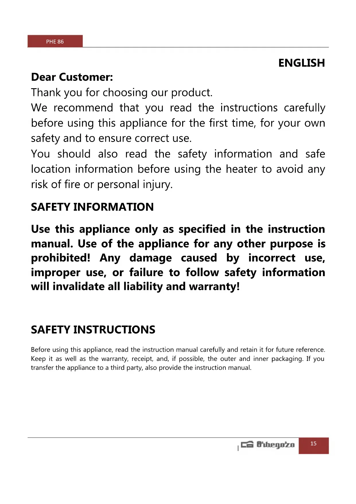 SAFETY INSTRUCTIONS Before using this appliance, read the instruction manual carefully and retain it for future reference. Keep it as well as the warranty, receipt, and, if possible, the outer and inner packaging. If you transfer the appliance to a third party, also provide the instruction manual.PHE 86