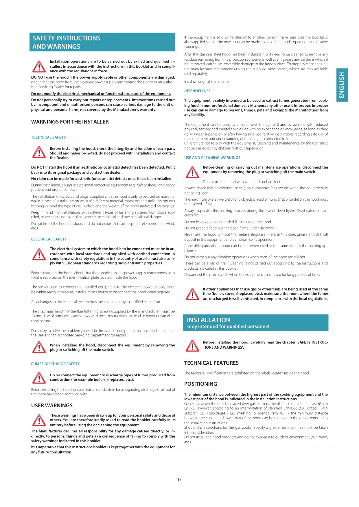 Do no connect the equipment to discharge pipes of fumes produced from combustion (for example boilers, replaces, etc.). Before installing the hood, ensure that all standards in force regarding discharge of air out of the room have been complied with. USER WARNINGS These warnings have been drawn up for your personal safety and those of others. You are therefore kindly asked to read the booklet carefully in its entirety before using the or cleaning the equipment. The Manufacturer declines all responsibility for any damage caused directly, or in- directly, to persons, things and pets as a consequence of failing to comply with the safety warnings indicated in this booklet. It is imperative that this instructions booklet is kept together with the equipment for any future consultation. If the equipment is sold or transferred to another person, make sure that the booklet is also supplied so that the new user can be made aware of the hood's operation and relative warnings. After the stainless steel hood has been installed, it will need to be cleaned to remove any residues remaining from the protection adhesive as well as any grease and oil stains which, if not removed, can cause irreversible damage to the hood surface. To properly clean the unit, the manufacturer recommends using the supplied moist wipes, which are also available sold separately. Insist on original spare parts. INTENDED USE The equipment is solely intended to be used to extract fumes generated from cook- ing food in non-professional domestic kitchens: any other use is improper. Improper use can cause damage to persons, things, pets and exempts the Manufacturer from any liability. The equipment can be used by children over the age of 8 and by persons with reduced physical, sensory and mental abilities, or with no experience or knowledge, as long as they do so under supervision or after having received relative instructions regarding safe use of the equipment and understanding of the dangers connected to it. Children are not to play with the equipment. Cleaning and maintenance by the user must not be carried out by children without supervision.
