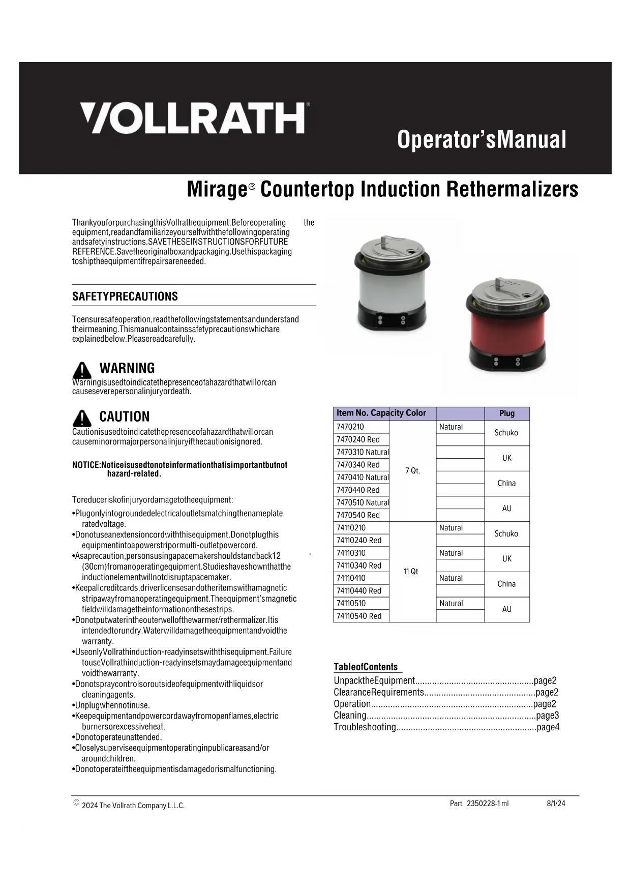 Find the device manual for free Mirage 7470410 Vollrath in PDF.