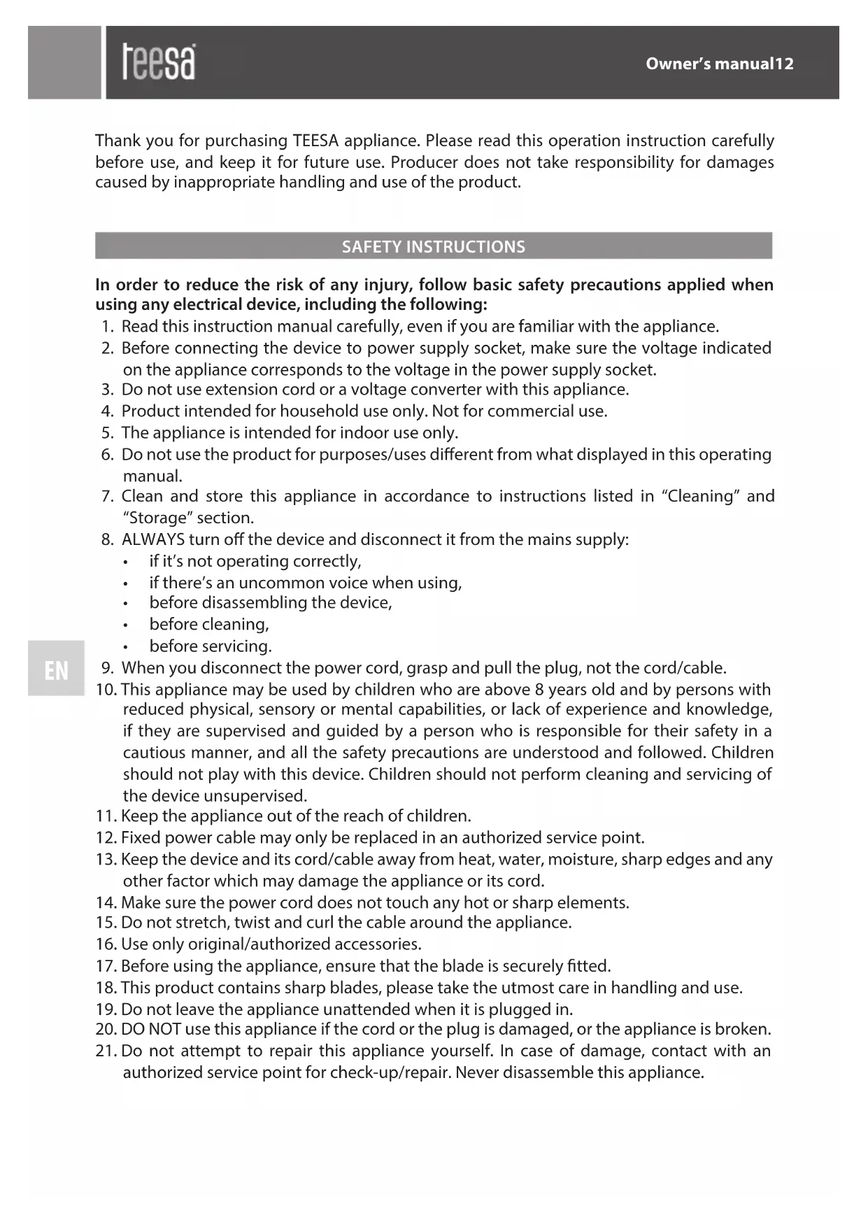 Thank you for purchasing TEESA appliance. Please read this operation instruction carefully before use, and keep it for future use. Producer does not take responsibility for damages caused by inappropriate handling and use of the product.