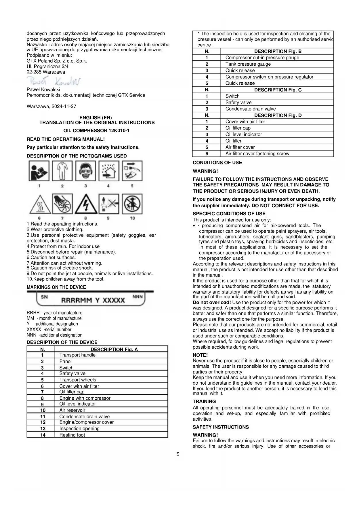 Electrically-powered products should not be disposed of with household waste, but should be taken to appropriate facilities for disposal. Contact your product dealer or local authority for information on disposal. Waste electrical and electronic equipment contains substances that are not environmentally friendly. Unrecycled equipment poses a potential risk to the environment and human health. "GTX Poland Spółka z ograniczoną odpowiedzialnością" Spółka komandytowa with its registered office in Warsaw, ul. Pograniczna 2/4 (hereinafter: "GTX Poland ") informs that all copyrights to the content of this manual (hereinafter: "Manual"), including among others. All copyrights to the contents of this Manual (hereinafter referred to as "Manual"), including but not limited to its text, photographs, diagrams, drawings, as well as its composition, belong exclusively to GTX Poland and are subject to legal protection pursuant to the Act of February 4, 1994 on Copyright and Related Rights (i.e. Journal of Laws 2006 No. 90 Item 631 as amended). Copying, processing, publishing, modifying for commercial purposes the entire Manual as well as its individual elements without the written consent of GTX Poland is strictly prohibited and may result in civil and criminal liability. EC Declaration of Conformity Manufacturer: GTX Poland Sp. z o.o. Sp.k, 2/4 Pograniczna Street 02-285 Warsaw Product: Compressor Model: 12K010-1 Trade name: NEO TOOLS Serial number: 00001 ÷ 99999 The product described above complies with the following documents: Machinery Directive 2006/42/EC Electromagnetic Compatibility Directive 2014/30/EU RoHS Directive 2011/65/EU as amended by Directive 2015/863/EU Noise Emission Directive 2000/14/EC as amended by 2005/88/EC Guaranteed Sound Power Level LWA= 97 dB(A) Measured Sound Power Level LWA = 95.5 dB(A) K=1.93 dB(A) And meets the requirements of the standards: EN 62841-1:2015; EN 62841-2-2:2014; EN IEC 61000-6-1:2019; EN IEC 61000-6-3:2021 EN IEC 63000:2018 EN 286-1: 1998/A2:2005 This declaration relates only to the machinery as placed on the market and does not include components added by the end user or carried out by him/her subsequently. Name and address of the EU resident person authorised to prepare the technical dossier: Signed on behalf of: GTX Poland Sp. z o.o. Sp.k. 2/4 Pograniczna Street 02-285 Warsaw Paweł Kowalski Technical Documentation Officer GTX Service Warsaw, 2024-11-27 DEUTSCH(DE)