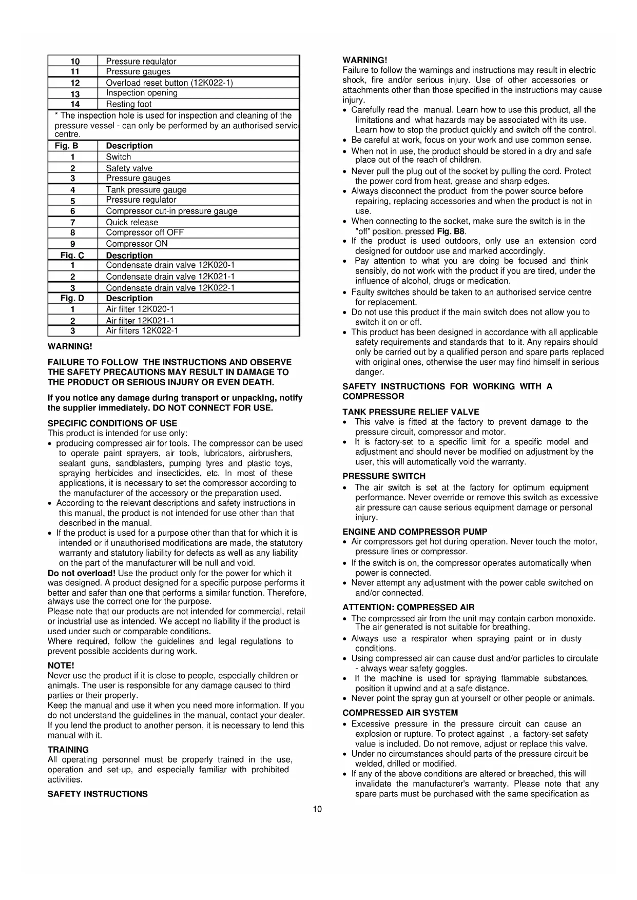 - The use of compressed air for the various purposes envisaged (inflating, pneumatic tools, painting, washing with water-based detergents only, etc.) requires knowledge of and compliance with the rules established for each individual application.