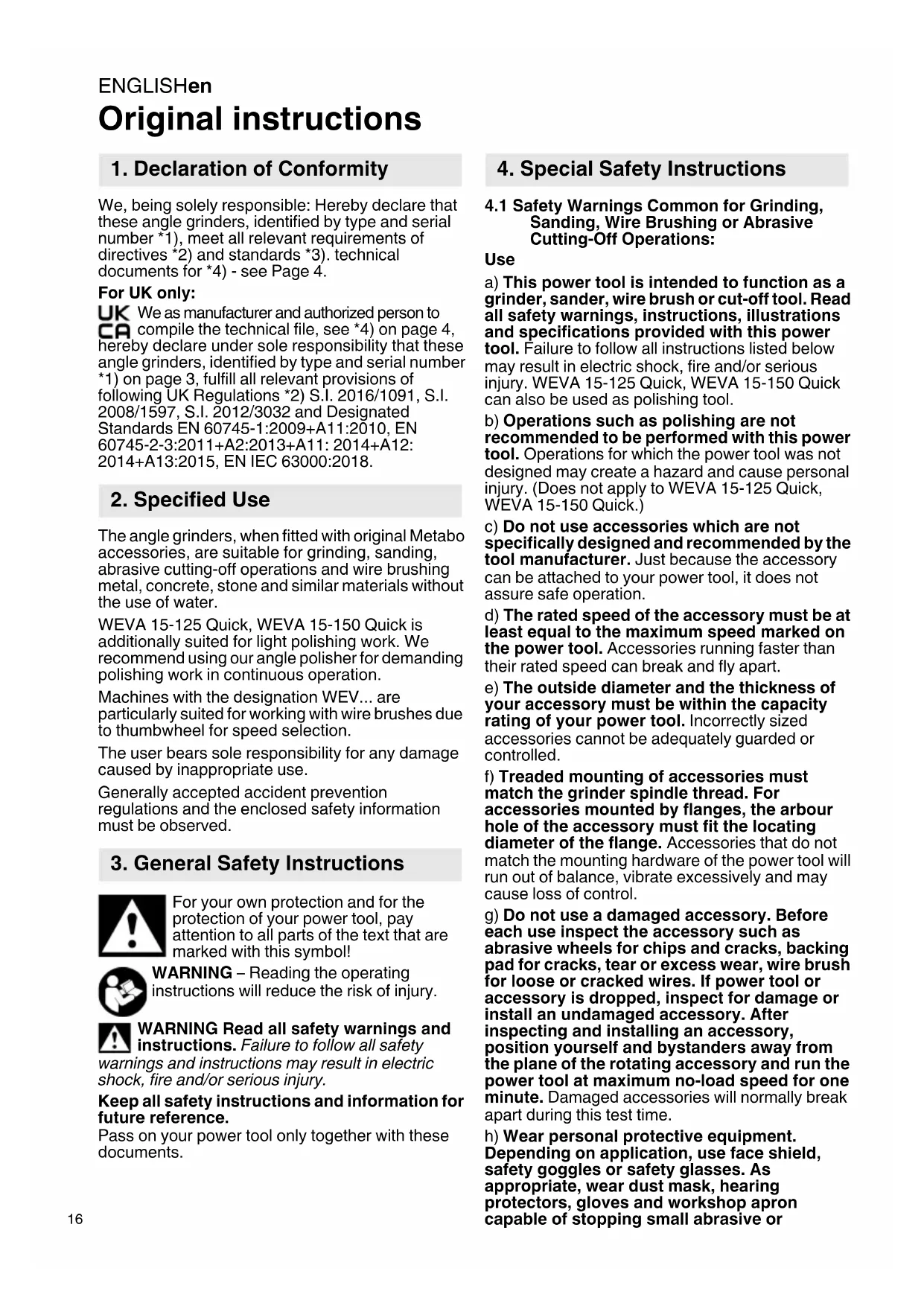 Original instructions We, being solely responsible: Hereby declare that these angle grinders, identified by type and serial number *1), meet all relevant requirements of directives *2) and standards *3). technical documents for *4) - see Page 4. For UK only: We as manufacturer and authorized person to compile the technical file, see *4) on page 4, hereby declare under sole responsibility that these angle grinders, identified by type and serial number *1) on page 3, fulfill all relevant provisions of following UK Regulations *2) S.I. 2016/1091, S.I. 2008/1597, S.I. 2012/3032 and Designated Standards EN 60745-1:2009+A11:2010, EN 60745-2-3:2011+A2:2013+A11: 2014+A12: 2014+A13:2015, EN IEC 63000:2018. The angle grinders, when fitted with original Metabo accessories, are suitable for grinding, sanding, abrasive cutting-off operations and wire brushing metal, concrete, stone and similar materials without the use of water. WEVA 15-125 Quick, WEVA 15-150 Quick is additionally suited for light polishing work. We recommend using our angle polisher for demanding polishing work in continuous operation. Machines with the designation WEV... are particularly suited for working with wire brushes due to thumbwheel for speed selection. The user bears sole responsibility for any damage caused by inappropriate use. Generally accepted accident prevention regulations and the enclosed safety information must be observed. For your own protection and for the protection of your power tool, pay attention to all parts of the text that are marked with this symbol! WARNING – Reading the operating instructions will reduce the risk of injury. WARNING Read all safety warnings and instructions. Failure to follow all safety warnings and instructions may result in electric shock, fire and/or serious injury. Keep all safety instructions and information for future reference. Pass on your power tool only together with these documents.