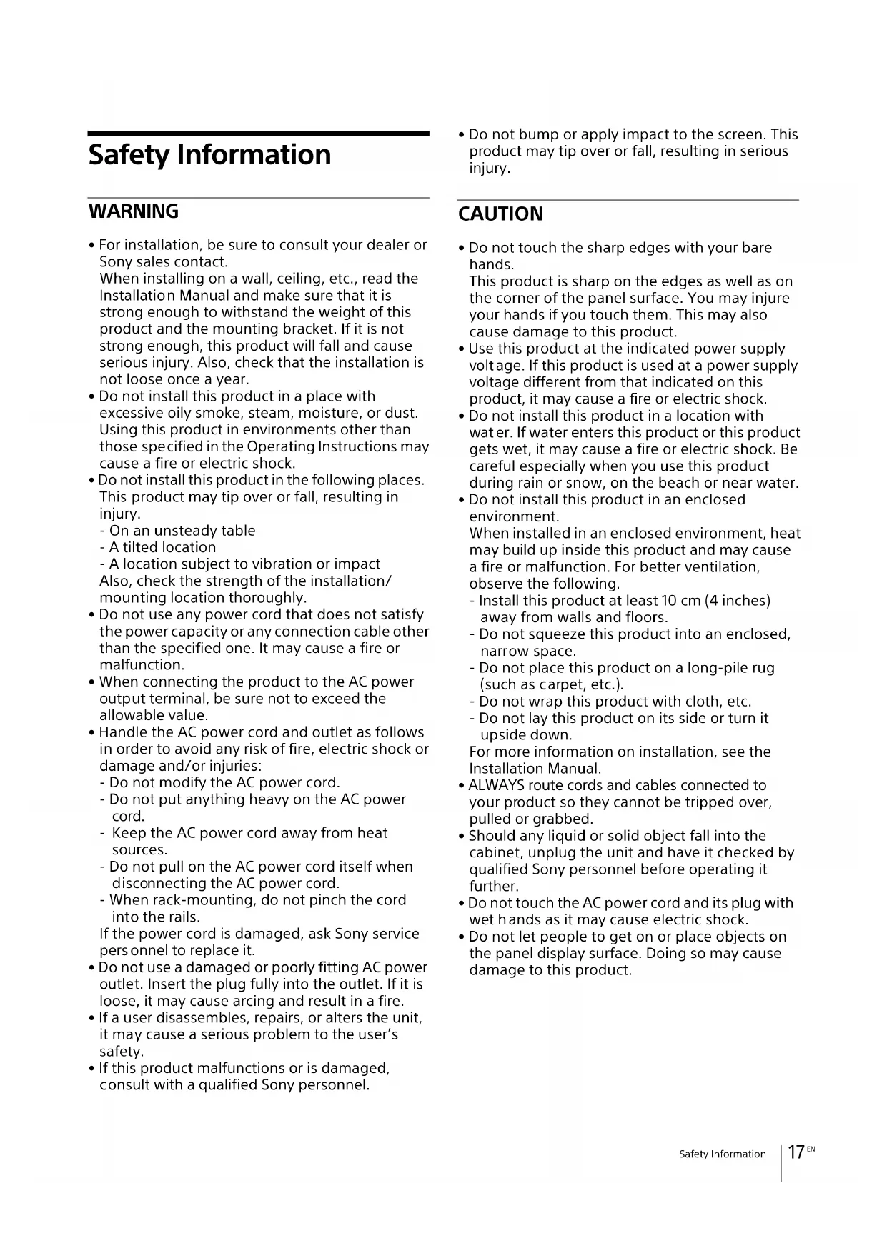 ending on the installation conditions. Be sure to inform the contractor who undertakes the insta llation or maintenance work about these effects. Precautions on visually induced motion sickness (VIMS) and postural instability Depending on the displayed content, display size, and viewing location (distance), a viewer may experience VIMS symptoms such as postural instability or nausea. The symptoms of VIMS may be severer after some