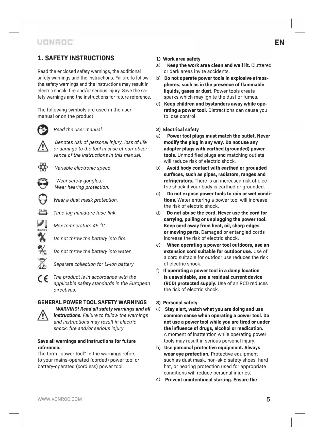 Before cleaning and maintenance, always switch off the machine and remove the battery pack from the machine. Clean the machine casings regularly with a soft cloth, preferably after each use. Make sure that the ventilation openings are free of dust and dirt. Re- move very persistent dirt using a soft cloth moiste- ned with soapsuds. Do not use any solvents such as gasoline, alcohol, ammonia, etc. Chemicals such as these will damage the synthetic components. ENVIRONMENT Faulty and/or discarded electrical or electronic apparatus have to be collected at the appropriate recycling locations. Only for EC countries Do not dispose of power tools into domestic waste. According to the European Guideline 2012/19/EC for Waste Electrical and Electronic Equipment and its implementation into national right, power tools that are no longer usable must be collected separately and disposed of in an environmentally friendly way. WARRANTY VONROC products are developed to the highest quality standards and are guaranteed free of defects in both materials and workmanship for the period lawfully stipulated starting from the date of original purchase. Should the product develop any failure during this period due to defective material and/or workmanship then contact VONROC directly. The following circumstances are excluded from this guarantee: