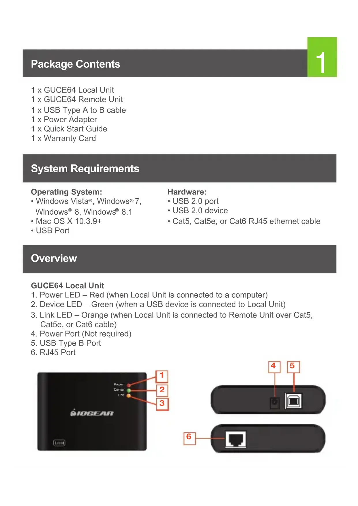 the included power adapter. Power LED on Remote Unit should show red. Remote Unit PowerDevice LinkLimited Warranty This product carries a 3 Year Limited Warranty. For the terms and conditions of this warranty, please go to http://www.iogear.com/support/warranty Register online at http://www.iogear.com/register Important Product Information Product Model Serial Number Compliance Information FCC Statement This equipment has been tested and found to comply with the limits for a Class B digital device, pursuant to Part 15 of the FCC Rules. These limits are designed to provide reasonable protection against harmful interference in a residential setting. This product generates, uses, and can radiate radio frequency energy and, if not installed and used as directed, it may cause harmful interference to radio communications. Although this product complies with the limits for a Class B digital device, there is no guarantee that interference will not occur in a particular installation. CE Compliance This device has been tested and found to comply with the following European Union directives: Electromagnetic Capability (2004/108/EC). Declaration of Conformity and related documents can be downloaded directly from our website: http://www.iogear.com/product/GUCE64/certifications.Contact WE’RE HERE TO HELP YOU! NEED ASSISTANCE SETTING UP THIS PRODUCT? Make sure you: