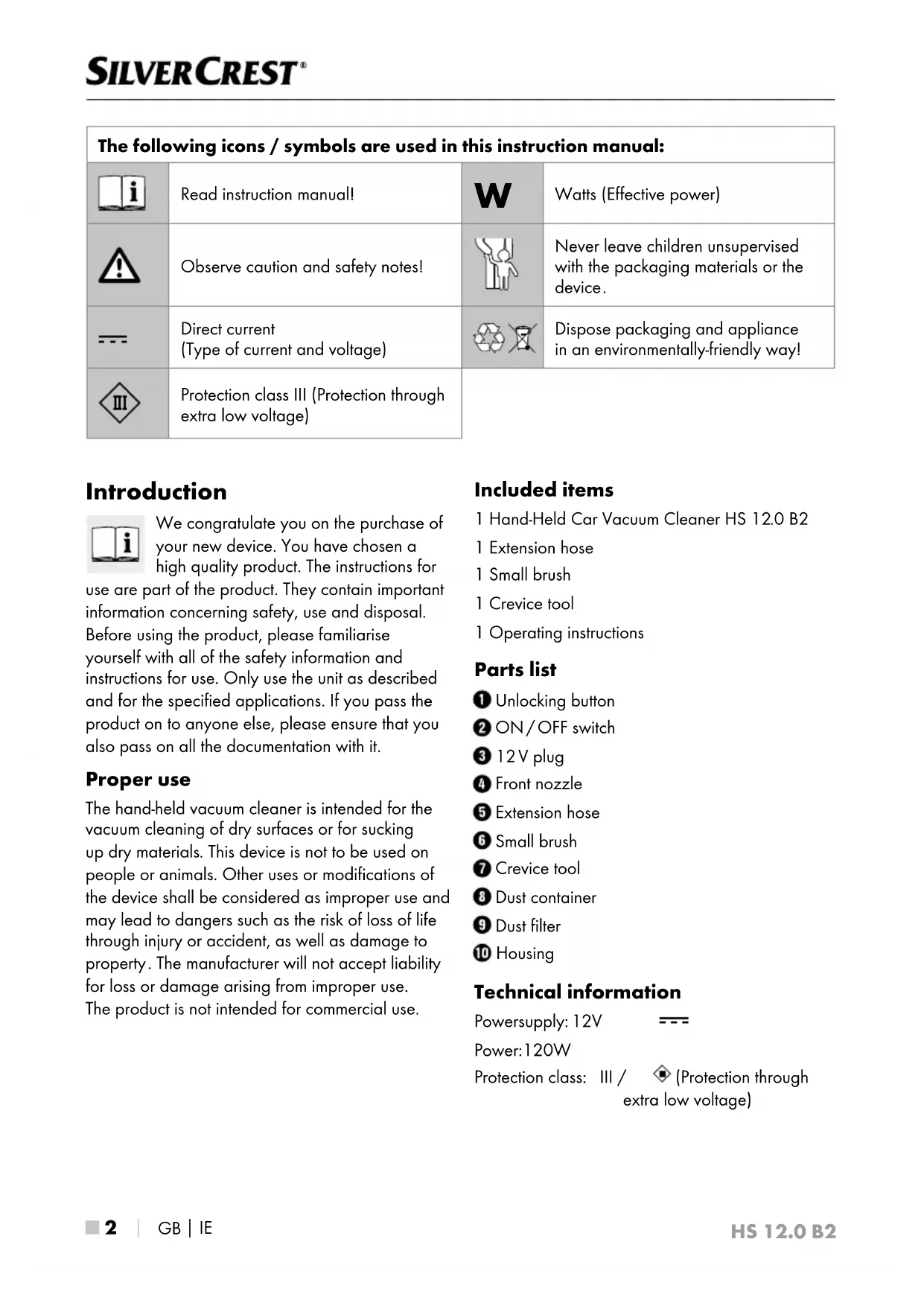 Introduction We congratulate you on the purchase of your new device. You have chosen a high quality product. The instructions for use are part of the product. They contain important information concerning safety, use and disposal. Before using the product, please familiarise yourself with all of the safety information and instructions for use. Only use the unit as described and for the specified applications. If you pass the product on to anyone else, please ensure that you also pass on all the documentation with it. Proper use The hand-held vacuum cleaner is intended for the vacuum cleaning of dry surfaces or for sucking up dry materials . This device is not to be used on people or animals. Other uses or modifications of the device shall be considered as improper use and may lead to dangers such as the risk of loss of life through injury or accident, as well as damage to property . The manufacturer will not accept liability for loss or damage arising from improper use. The product is not intended for commercial use. Included items 1 Hand-Held Car Vacuum Cleaner HS 12 .0 B2 1 Extension hose 1 Small brush 1 Crevice tool 1 Operating instructions Parts list Unlocking button ON / OFF switch 12 V plug Front nozzle Extension hose Small brush Crevice tool Dust container Dust filter Housing Technical information Power supply: 12 V Power: 120 W Protection class: III / (Protection through extra low voltage) The following icons / symbols are used in this instruction manual: Read instruction manual!
