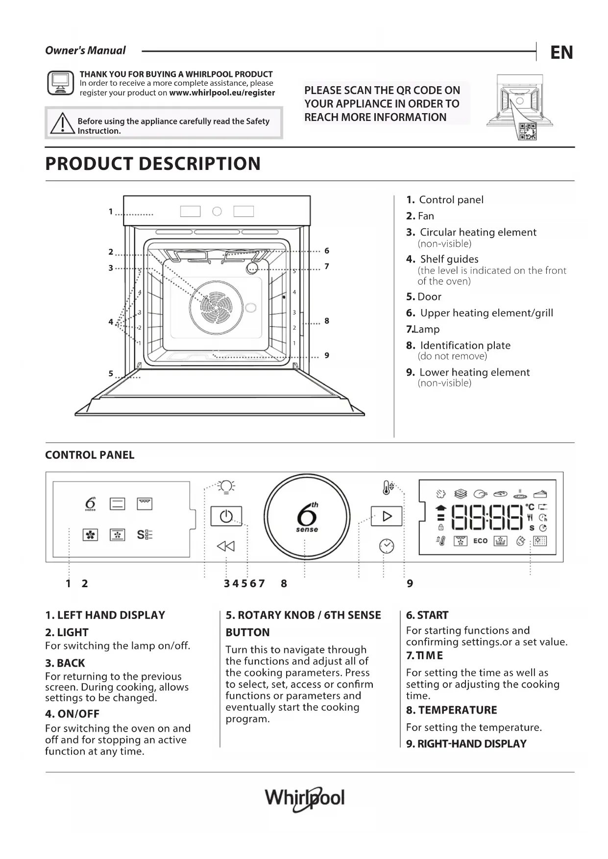 Owner's Manual THANK YOU FOR BUYING A WHIRLPOOL PRODUCT In order to receive a more complete assistance, please register your product on www . whirlpool. eu/ register Before using the appliance carefully read the Safety Instruction. PRODUCT DESCRIPTION CONTROL PANEL